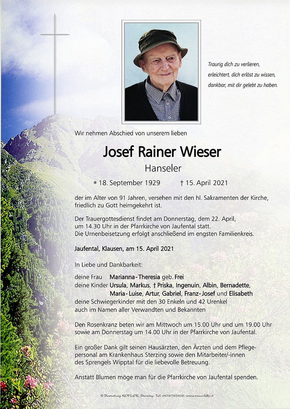 Der Trauergottesdienst findet am Donnerstag, dem 22. April, um 14.30 Uhr in der Pfarrkirche von Jaufental statt.