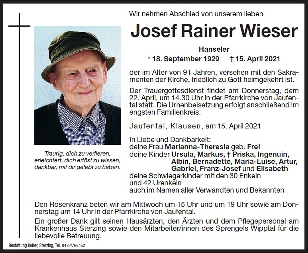 Ein großer Dank gilt seinen Hausärzten, den Ärzten und dem Pflegepersonal am Krankenhaus Sterzing sowie den Mitarbeiter/-innen des Sprengels Wipptal für die liebevolle Betreuung.