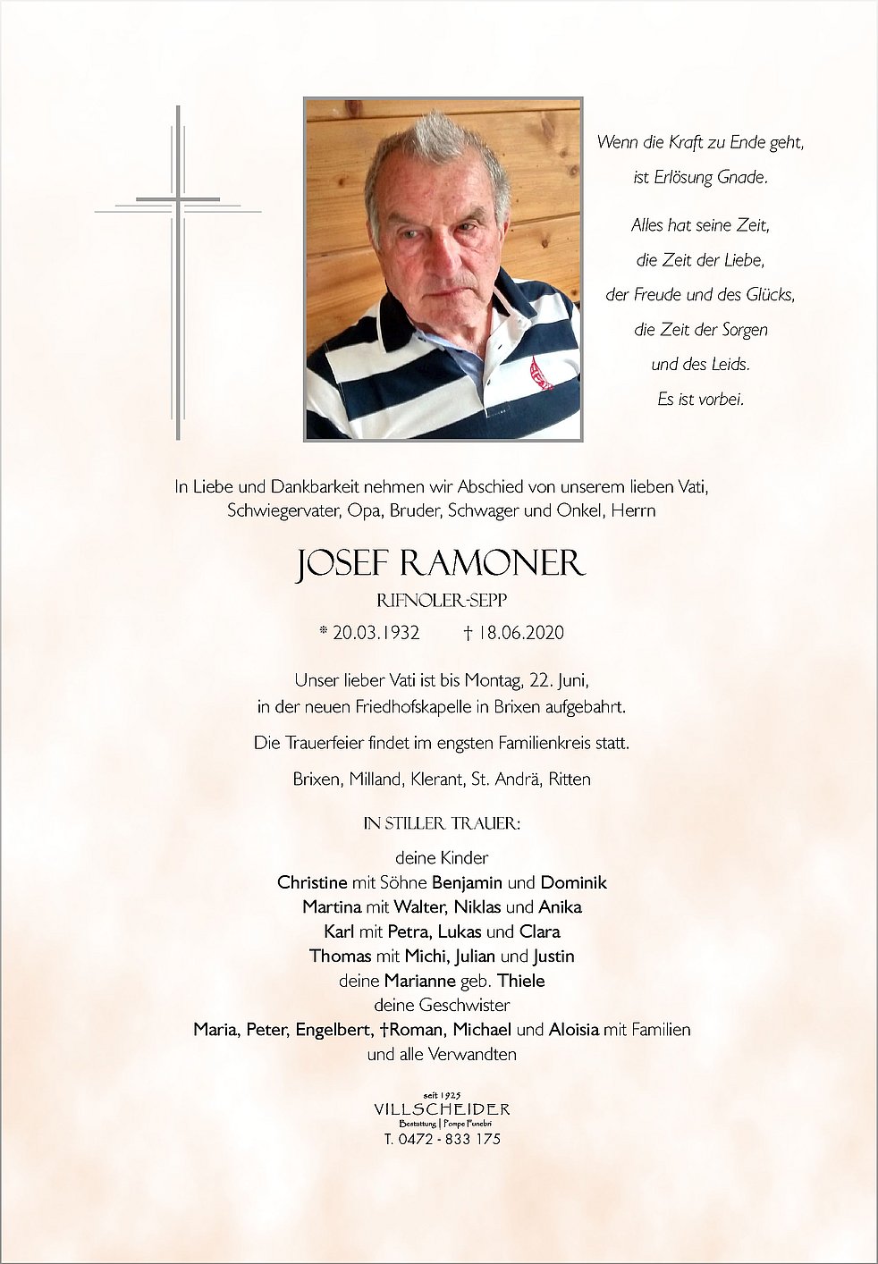Trauerfeier: 22.06. - 15:00 Uhr Brixen