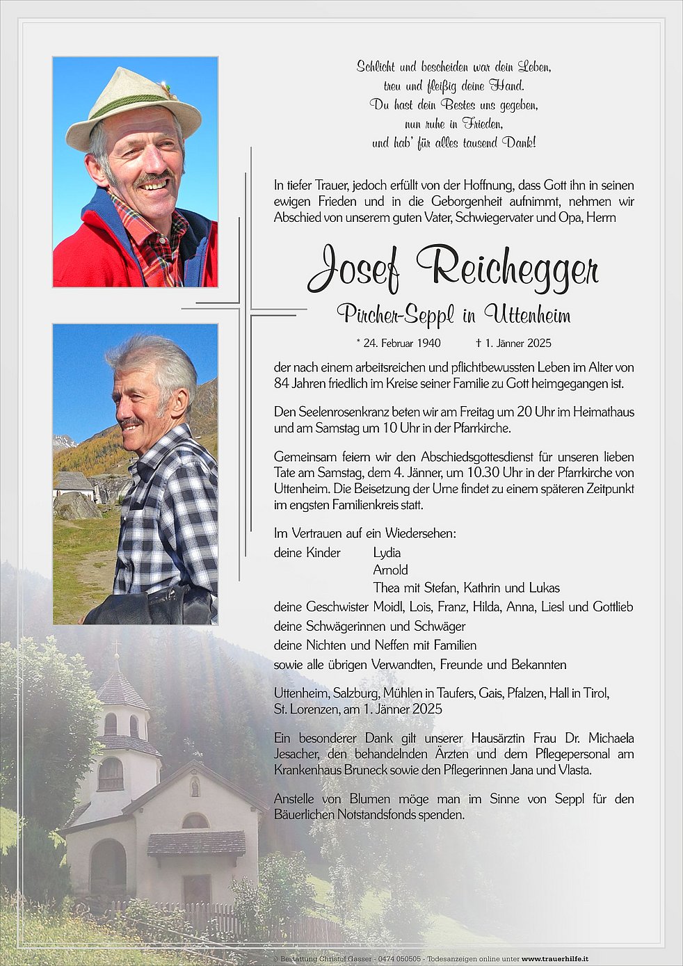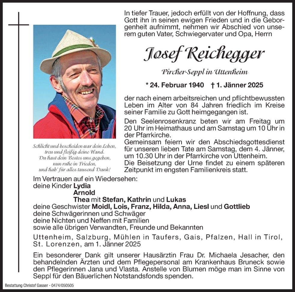 Anstelle von Blumen möge man im Sinne von Seppl für den Bäuerlichen Notstandsfonds spenden.