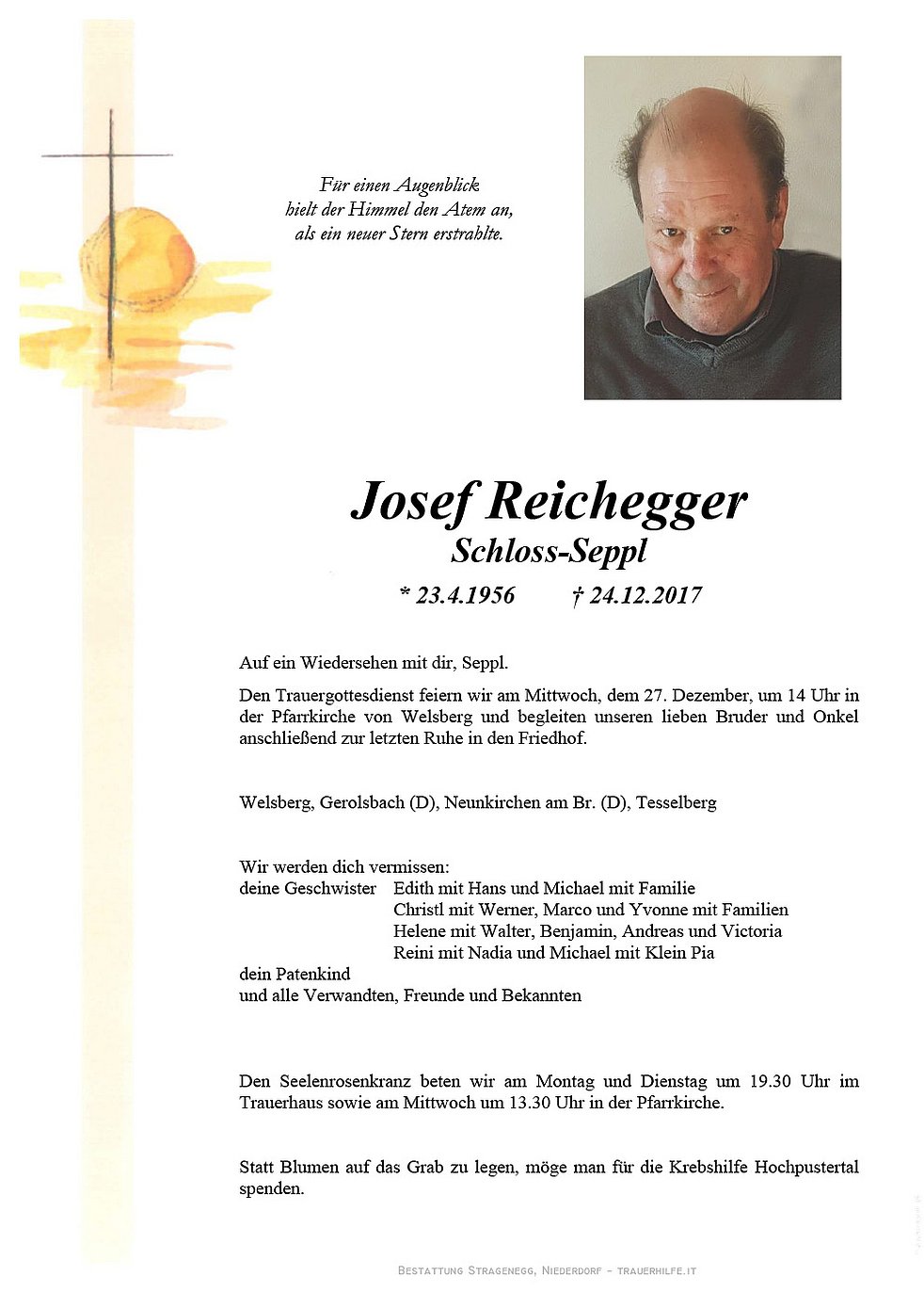 Den Trauergottesdienst feiern wir am Mittwoch, dem 27. Dezember, um 14 Uhr in der Pfarrkirche von Welsberg und begleiten unseren lieben Bruder und Onkel anschließend zur letzten Ruhe in den Friedhof.