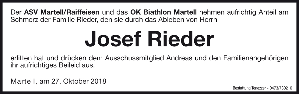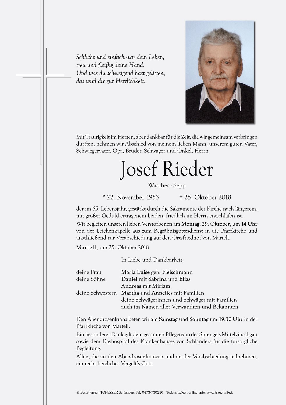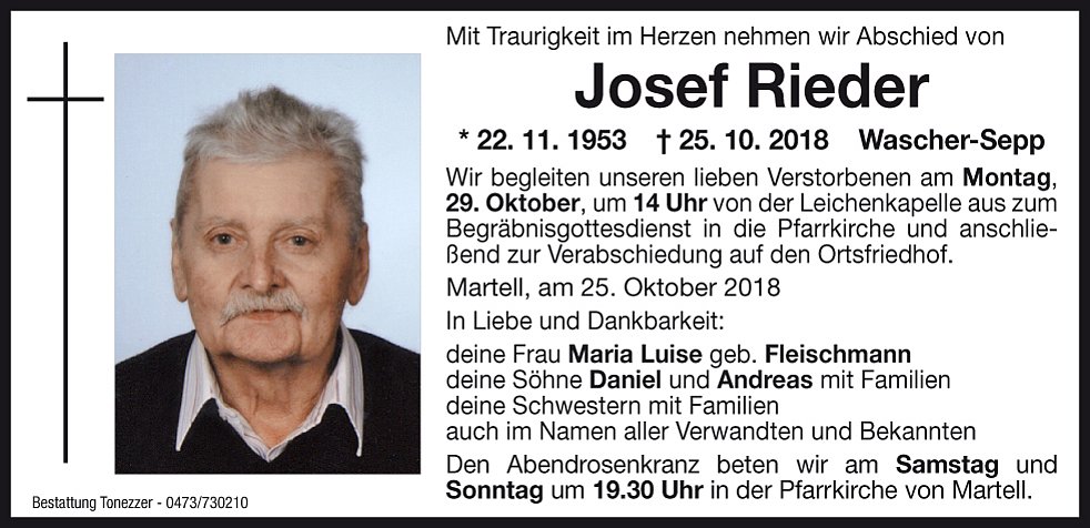 Wir begleiten unseren lieben Verstorbenen am Montag, 29. Oktober, um 14 Uhr von der Leichenkapelle aus zum Begräbnisgottesdienst in die Pfarrkirche und anschließend zur Verabschiedung auf den Ortsfriedhof von Martell.