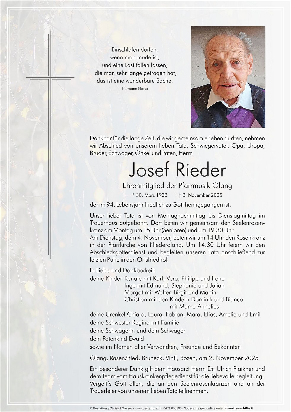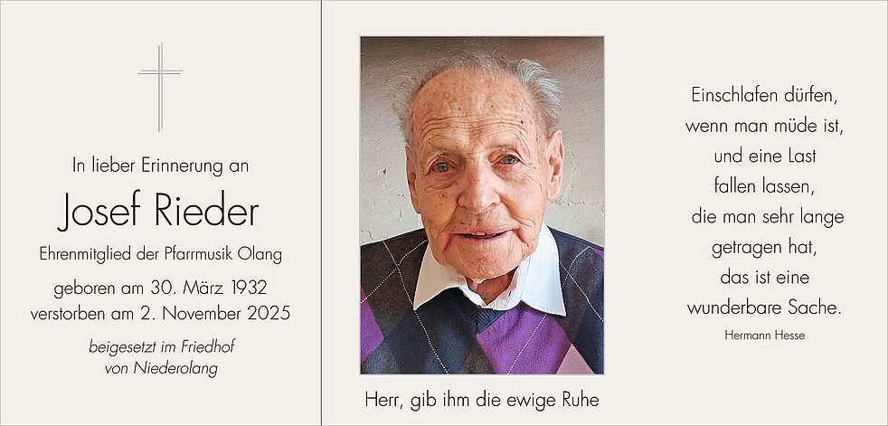 Unser lieber Tata ist von Montagnachmittag bis Dienstagmittag im Trauerhaus aufgebahrt. Dort beten wir gemeinsam den Seelenrosen-kranz am Montag um 15 Uhr (Senioren) und um 19.30 Uhr. Am Dienstag, dem 4. November, beten wir um 14 Uhr den Rosenkranz in der Pfarrkirche von Niederolang. Um 14.30 Uhr feiern wir den Abschiedsgottesdienst und begleiten unseren Tata anschließend zur letzten Ruhe in den Ortsfriedhof.
