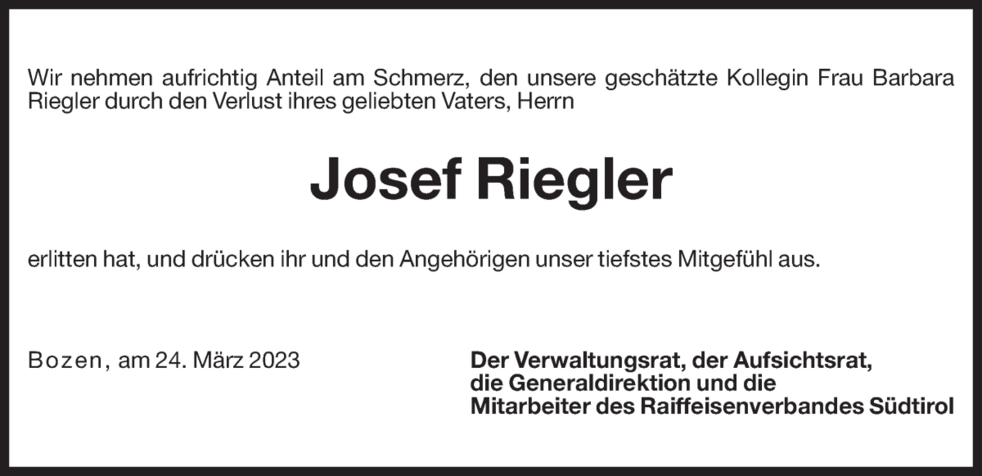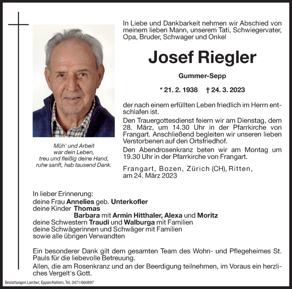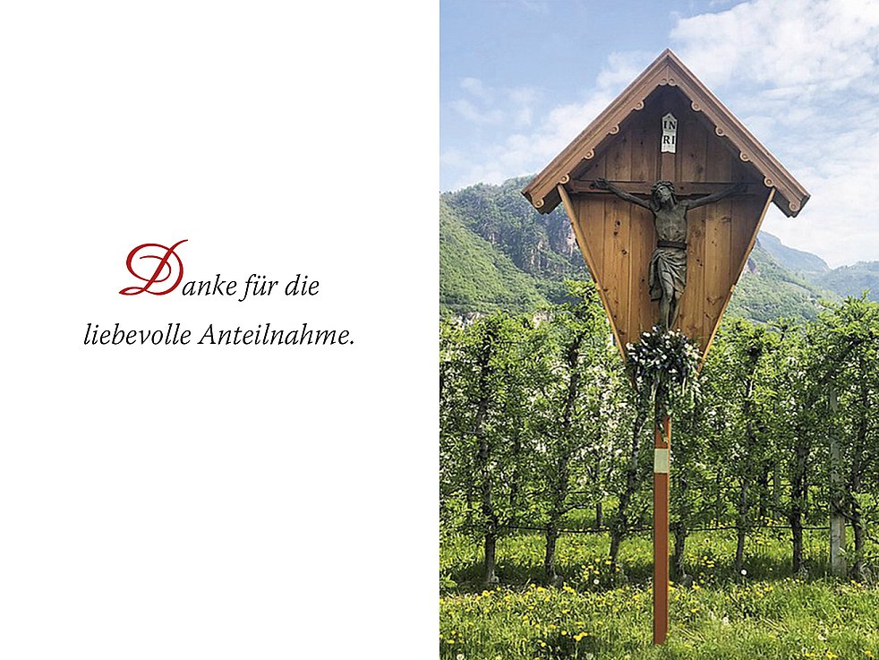 Den Trauergottesdienst feiern wir am Dienstag, dem 28. März um 14.30 Uhr in der Pfarrkirche von Frangart.