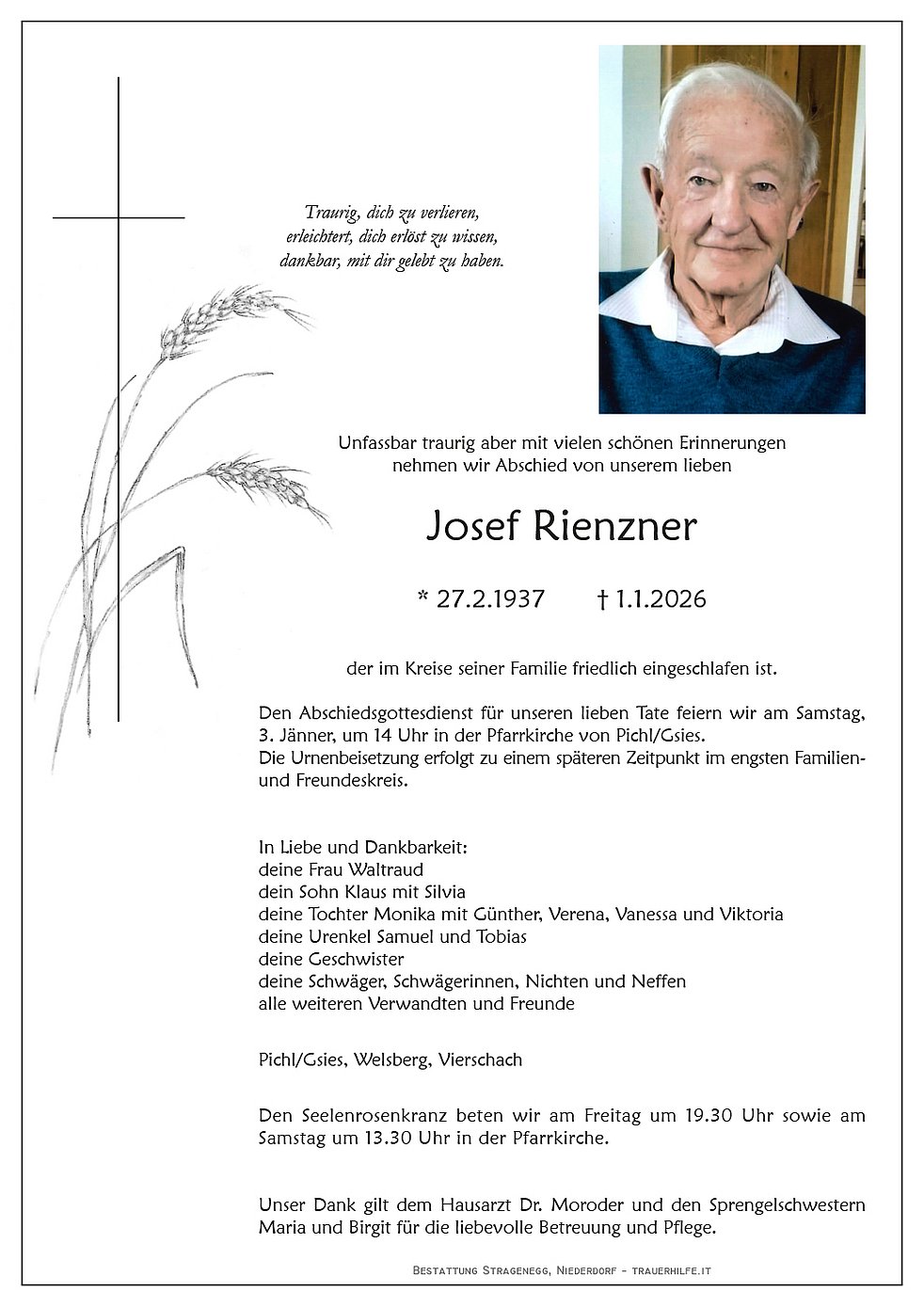 Trauerfeier: 03.01. - 14:00 Uhr Pichl/Gsies