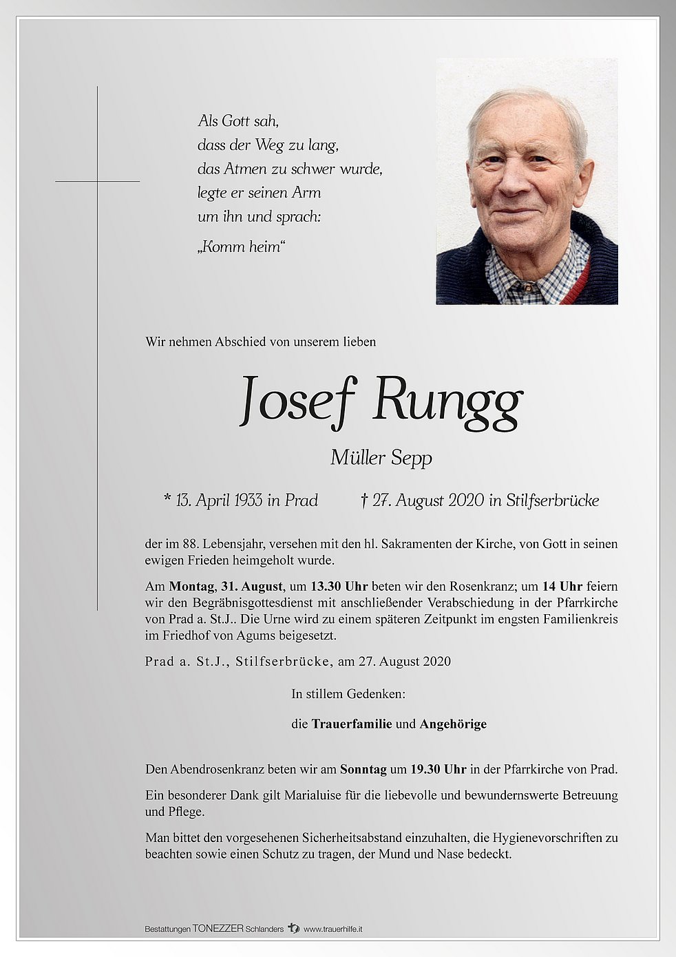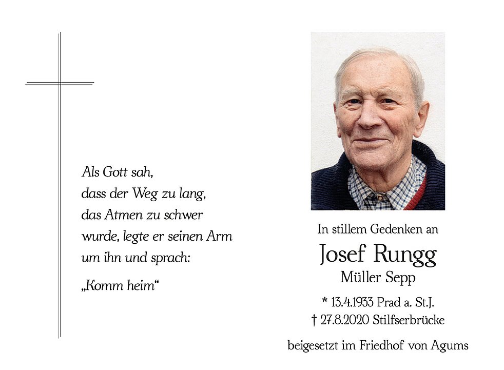 Am Montag, 31. August, um 13.30 Uhr beten wir den Rosenkranz; um 14 Uhr feiern wir den Begräbnisgottesdienst mit anschließender Verabschiedung in der Pfarrkirche von Prad a. St.J..