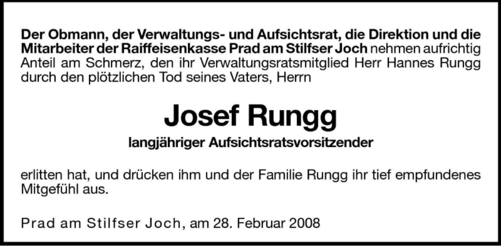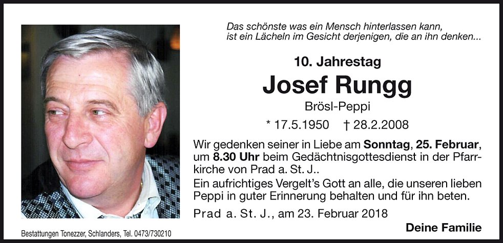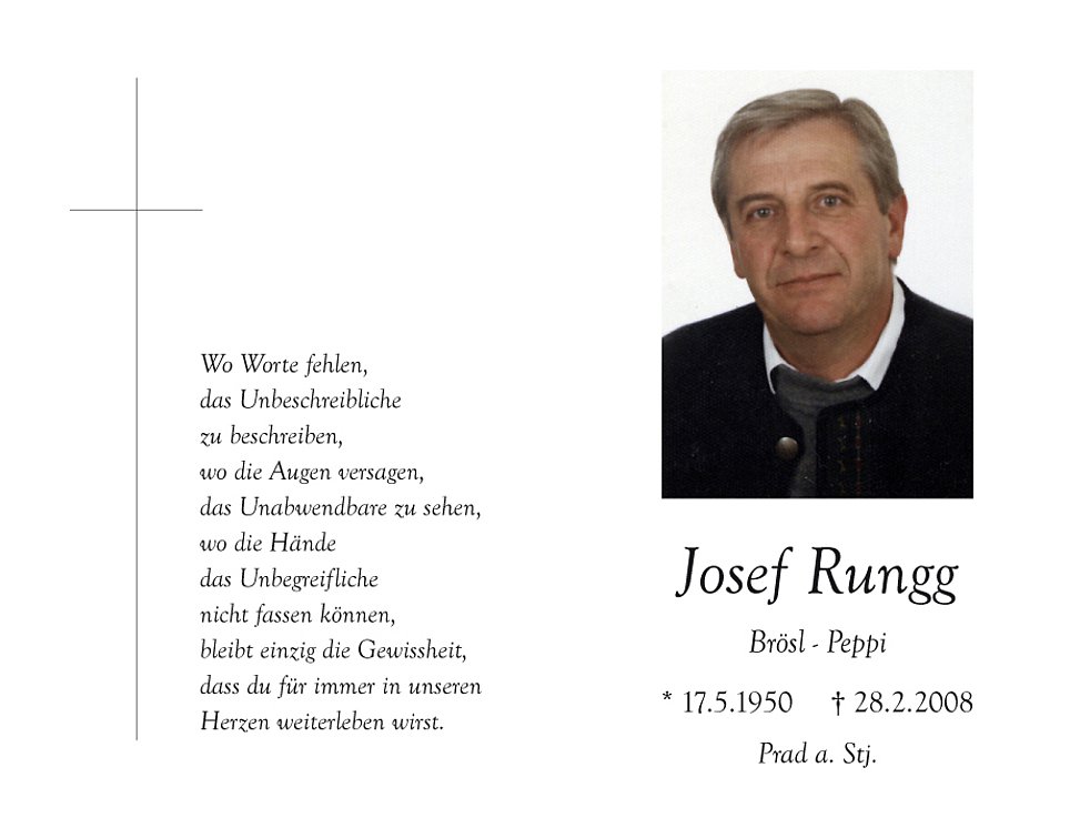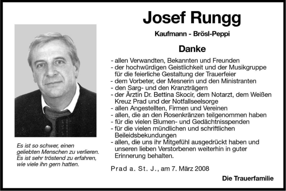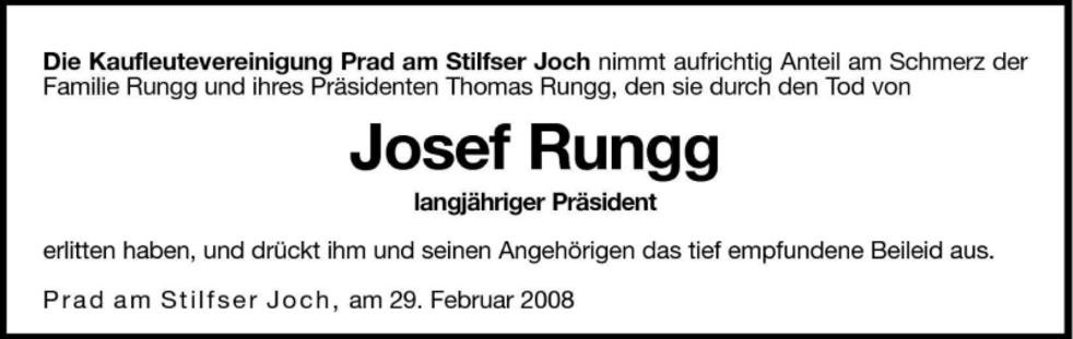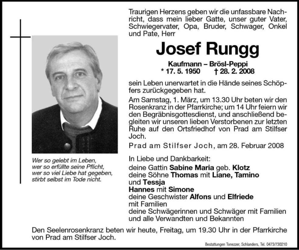 Am Samstag, 1. März, um 13.30 Uhr beten wir den Rosenkranz in der Pfarrkirche; um 14 Uhr feiern wir den Begräbnisgottesdienst und anschließend begleiten wir unseren lieben Verstorbenen zur letzten Ruhe auf den Ortsfriedhof von Prad a.Stj.