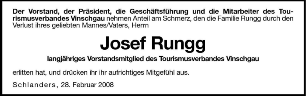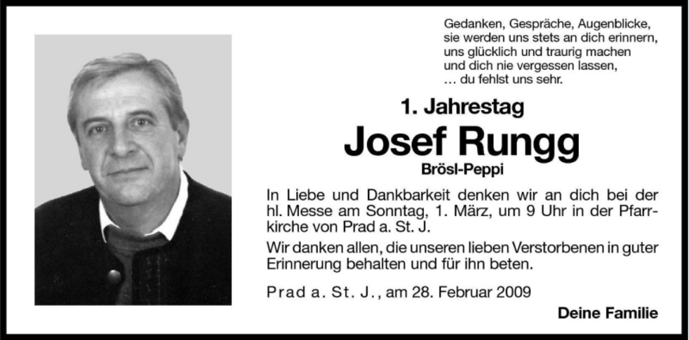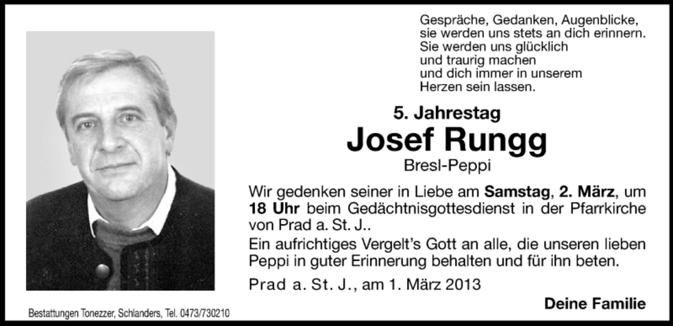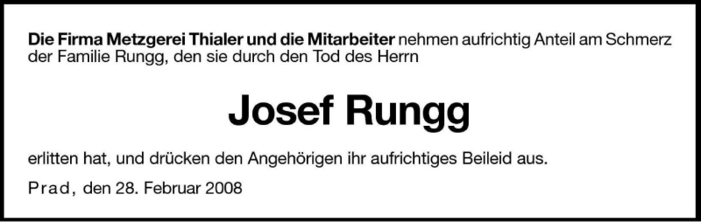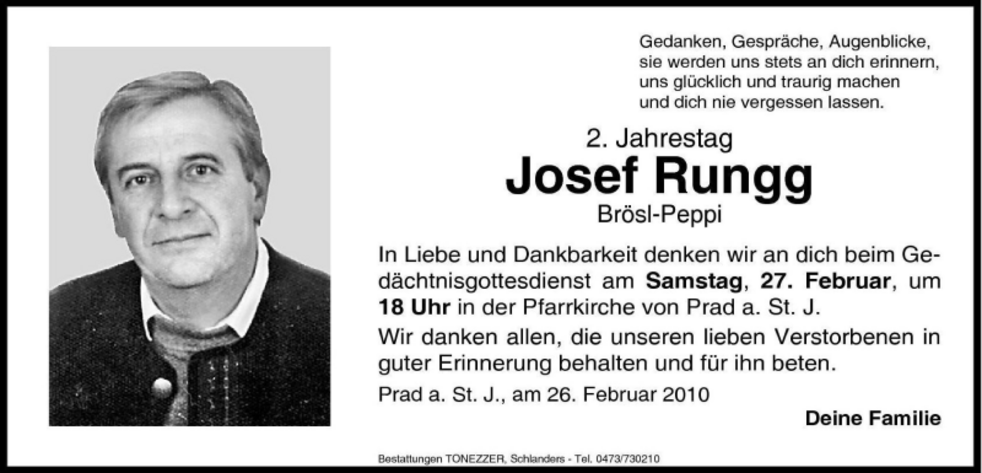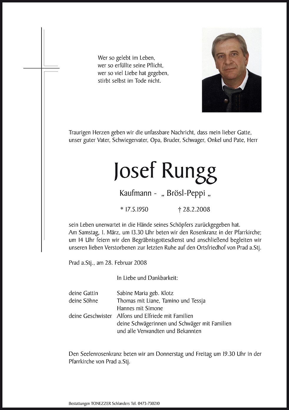 Am Samstag, 1. März, um 13.30 Uhr beten wir den Rosenkranz in der Pfarrkirche; um 14 Uhr feiern wir den Begräbnisgottesdienst und anschließend begleiten wir unseren lieben Verstorbenen zur letzten Ruhe auf den Ortsfriedhof von Prad a.Stj.