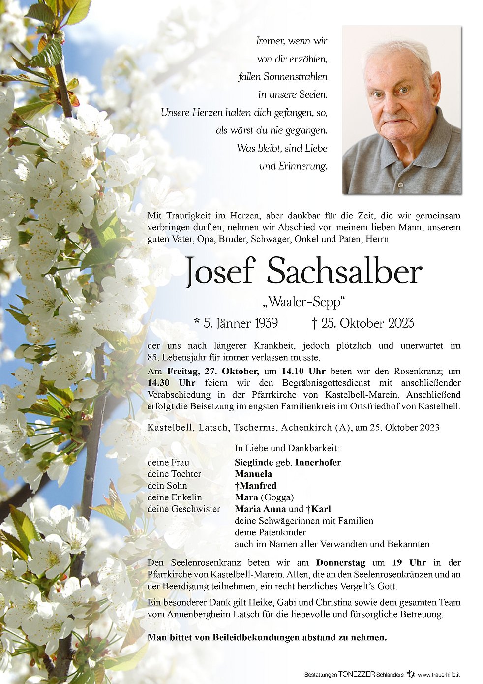 Am Freitag, 27. Oktober, um 14.10 Uhr beten wir den Rosenkranz; um 14.30 Uhr feiern wir den Begräbnisgottesdienst mit anschließender Verabschiedung in der Pfarrkirche von Kastelbell-Marein. Anschließend erfolgt die Beisetzung im engsten Familienkreis im Ortsfriedhof von Kastelbell.