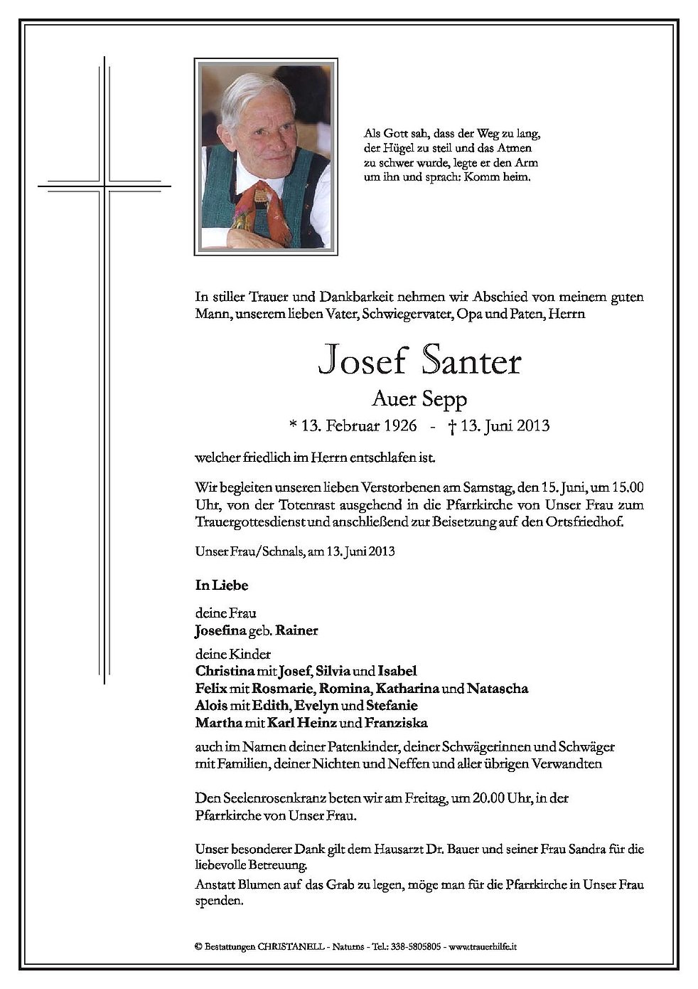 Wir begleiten unseren lieben Verstorbenen am Samstag, den 15. Juni, um 15.00 Uhr, von der Totenrast ausgehend in die Pfarrkirche von Unser Frau zum Trauergottesdienst und anschließend zur Beisetzung auf den Ortsfriedhof.