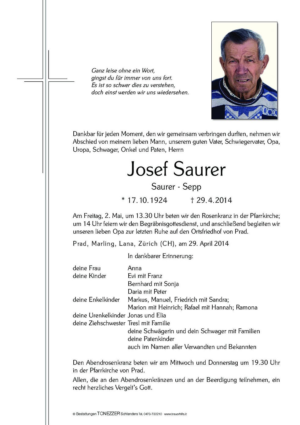 Am Freitag, 2. Mai, um 13.30 Uhr beten wir den Rosenkranz in der Pfarrkirche; um 14 Uhr feiern wir den Begräbnisgottesdienst, und anschließend begleiten wir unseren lieben Opa zur letzten Ruhe auf den Ortsfriedhof von Prad.