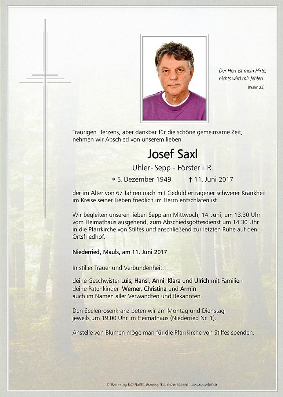 Wir begleiten unseren lieben Sepp am Mittwoch, 14. Juni, um 13.30 Uhr vom Heimathaus ausgehend, zum Abschiedsgottesdienst um 14.30 Uhr in die Pfarrkirche von Stilfes und anschließend zur letzten Ruhe auf den Ortsfriedhof.