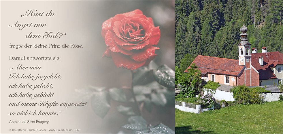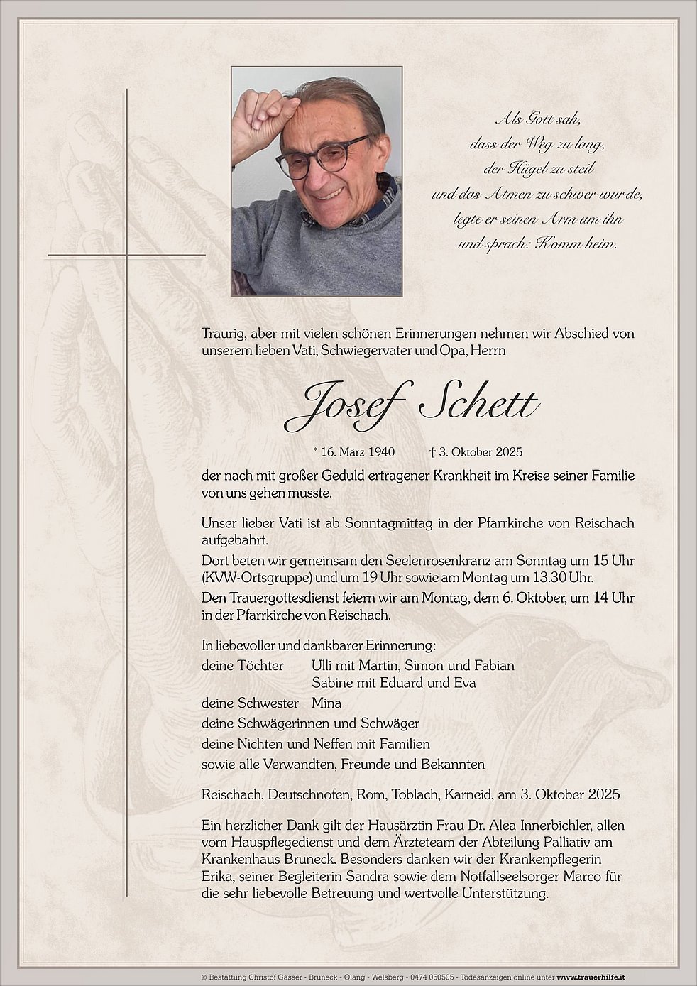 Ein herzlicher Dank gilt der Hausärztin Frau Dr. Alea Innerbichler, allen vom Hauspflegedienst und dem Ärzteteam der Abteilung Palliativ am Krankenhaus Bruneck. Besonders danken wir der Krankenpflegerin Erika, seiner Begleiterin Sandra sowie dem Notfallseelsorger Marco für die sehr liebevolle Betreuung und wertvolle Unterstützung.