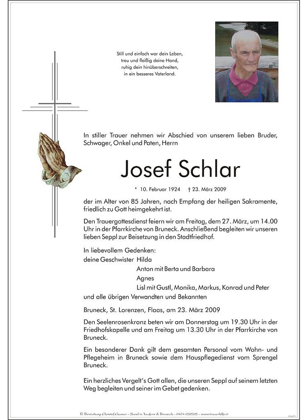 Den Trauergottesdienst feiern wir am Freitag, dem 27. März, um 14.00 Uhr in der Pfarrkirche von Bruneck. Anschließend begleiten wir unseren lieben Seppl zur Beisetzung in den Stadtfriedhof.