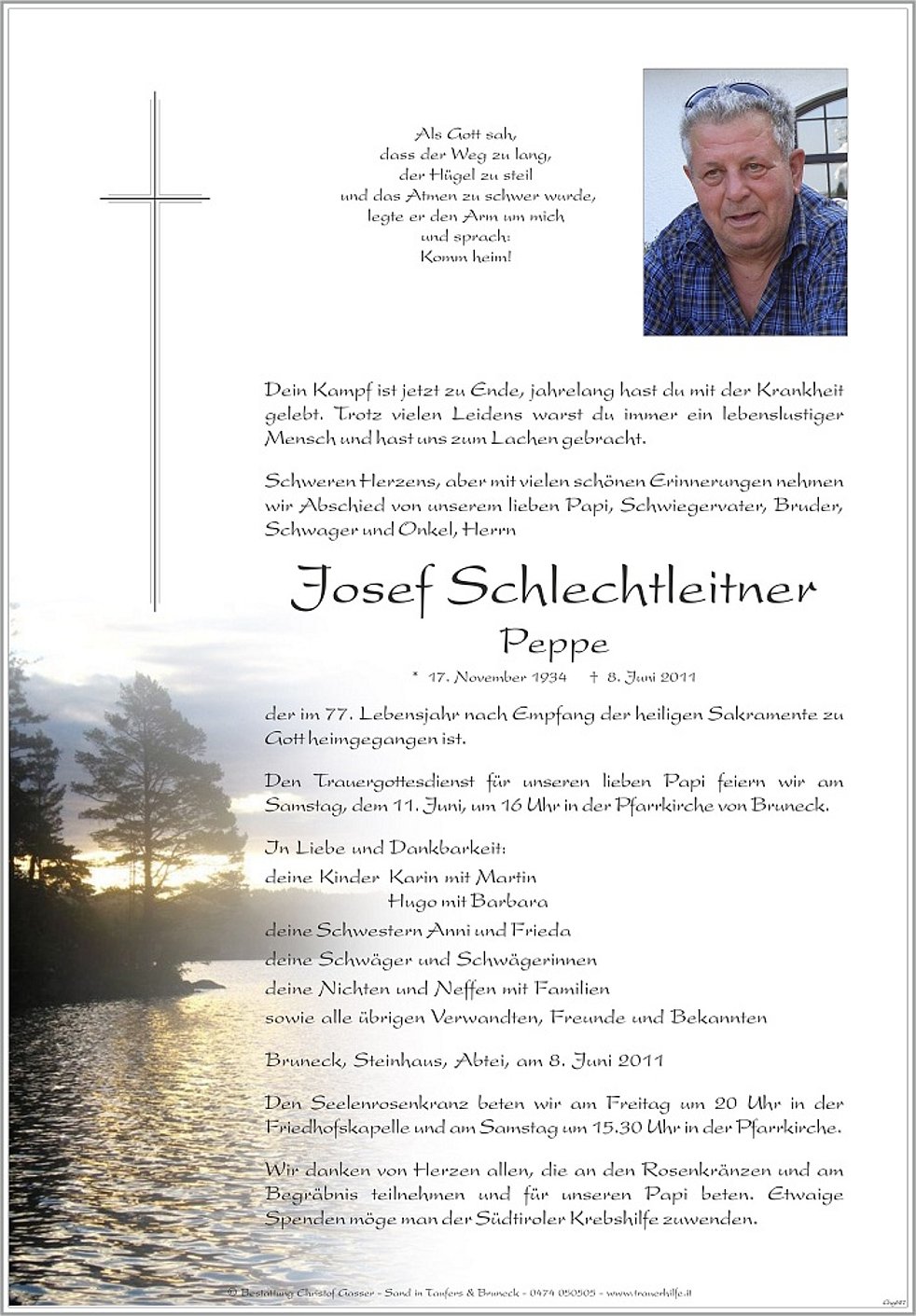Den Trauergottesdienst für unseren lieben Papi feiern wir am Samstag, dem 11. Juni, um 16 Uhr in der Pfarrkirche von Bruneck.