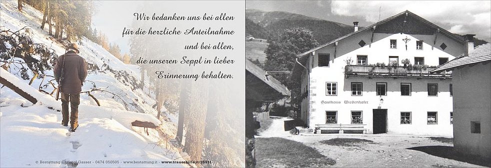 Ein großes Vergelt’s Gott gilt den Ärzten und dem Pflegepersonal der Abteilungen Onkologie und Palliativ am Krankenhaus Bruneck, den Sprengelschwestern sowie Dr. Elia Maglia und Dr. Oswald Thalmann für die fürsorgliche Begleitung.