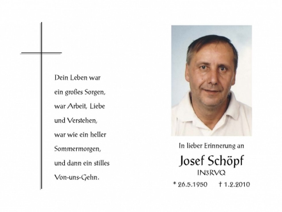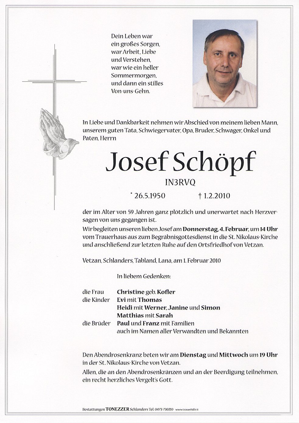 Wir begleiten unseren lieben Josef am Donnerstag, 4. Februar, um 14 Uhr vom Trauerhaus aus zum Begräbnisgottesdienst in die St. Nikolaus-Kirche und anschließend zur letzten Ruhe auf den Ortsfriedhof von Vetzan.