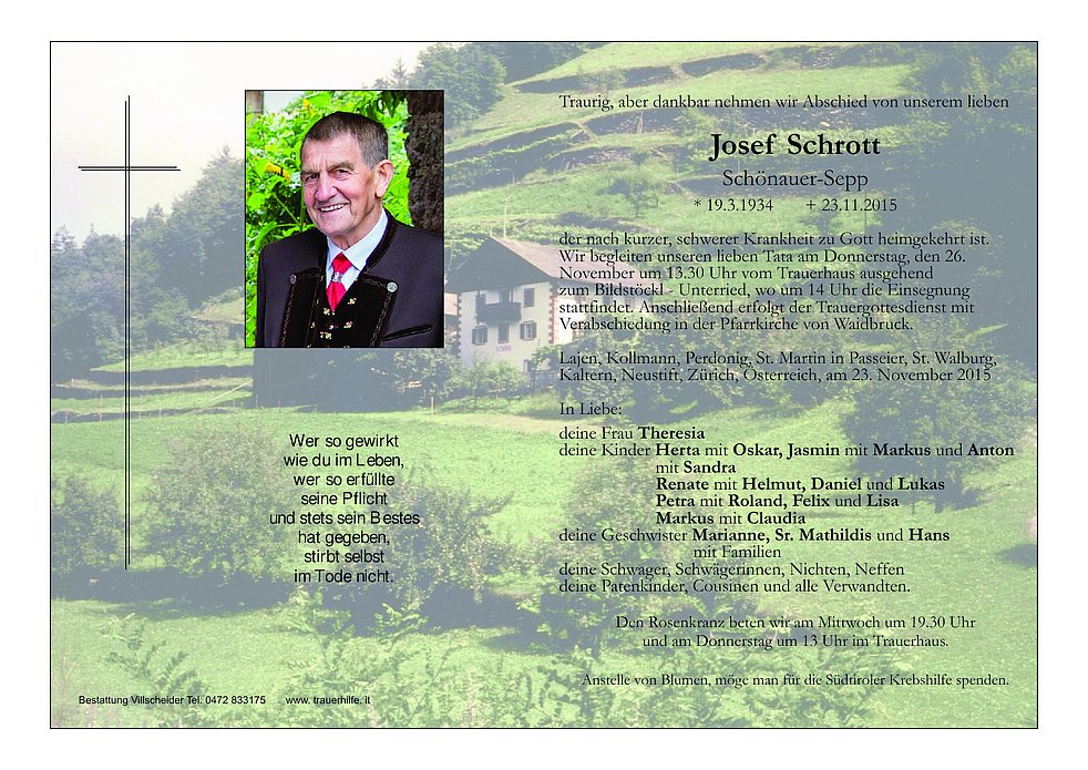 Anstelle von Blumen, möge man für die Südtiroler Krebshilfe spenden.