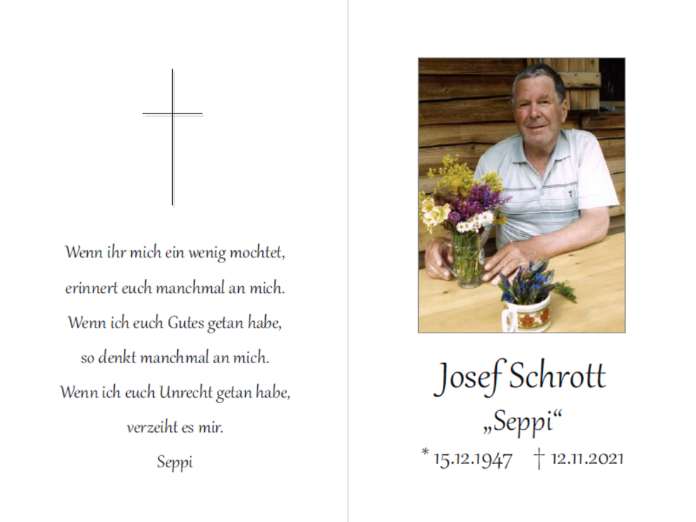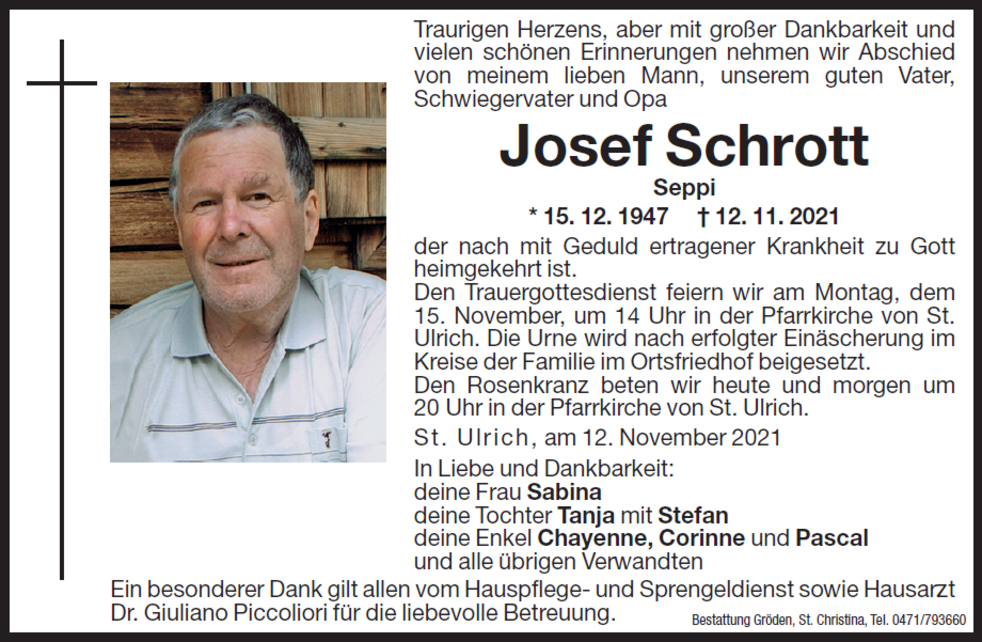 Den Trauergottesdienst feiern wir am Montag, dem 15. November, um 14 Uhr in der Pfarrkirche von St. Ulrich. Die Urne wird nach erfolgter Einäscherung im Kreise der Familie im Ortsfriedhof beigesetzt.