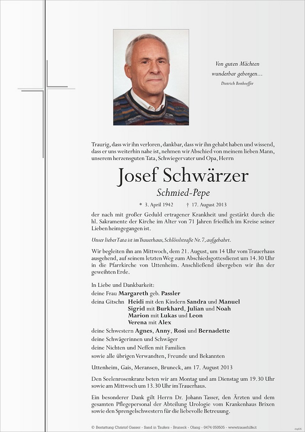 Wir begleiten ihn am Mittwoch, dem 21. August, um 14 Uhr vom Trauerhaus ausgehend, auf seinem letzten Weg zum Abschiedsgottesdienst um 14.30 Uhr in die Pfarrkirche von Uttenheim. Anschließend übergeben wir ihn der geweihten Erde.