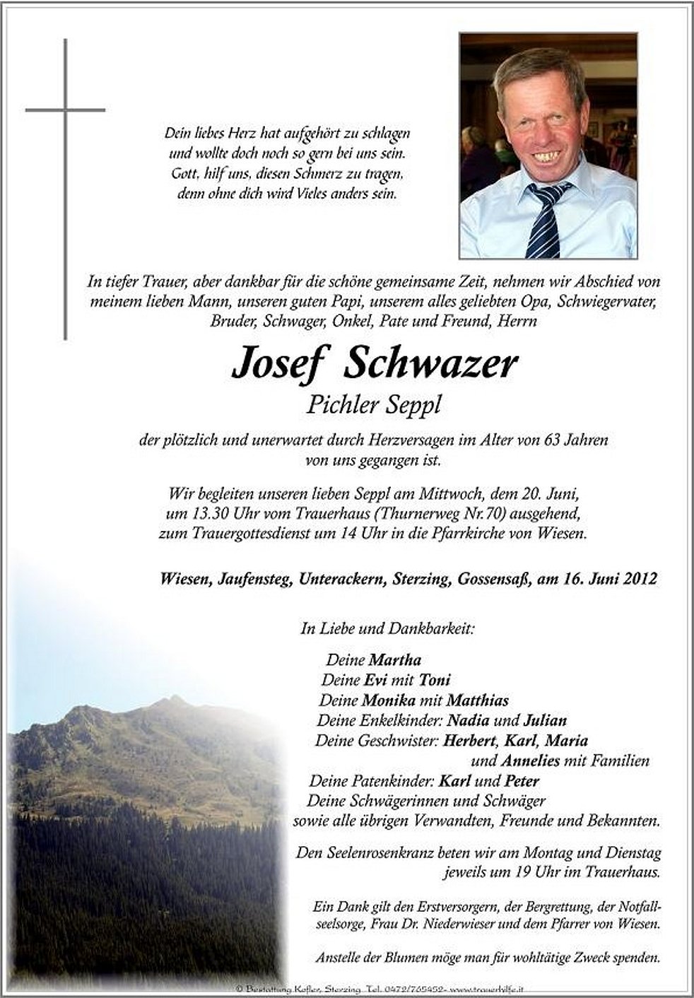 Wir begleiten unseren lieben Seppl am Mittwoch, dem 20. Juni, um 13.30 Uhr