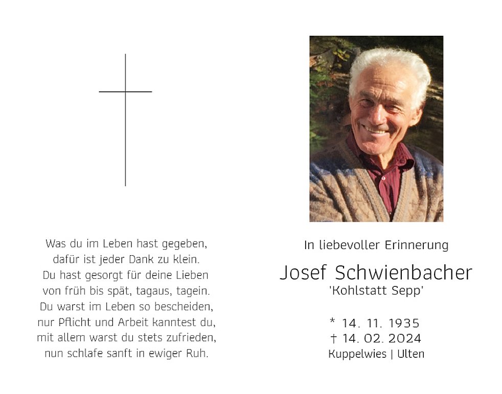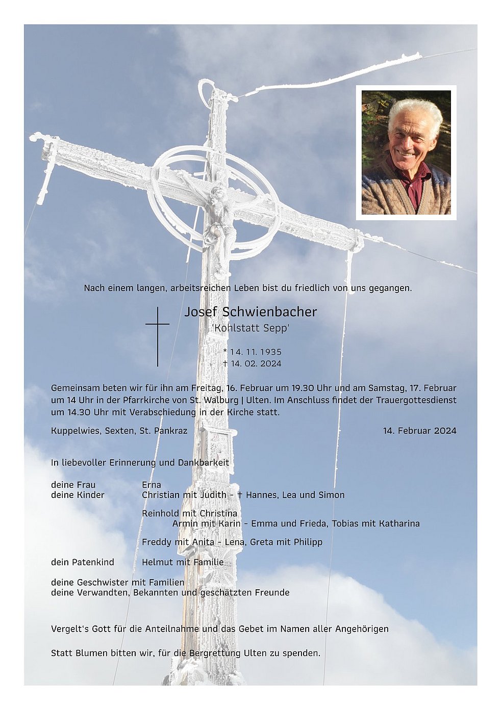 Gemeinsam beten wir für ihn am Freitag, 16. Februar um 19.30 Uhr und am Samstag, 17. Februar um 14 Uhr in der Pfarrkirche von St. Walburg | Ulten. Im Anschluss findet der Trauergottesdienst um 14.30 Uhr mit Verabschiedung in der Kirche statt.