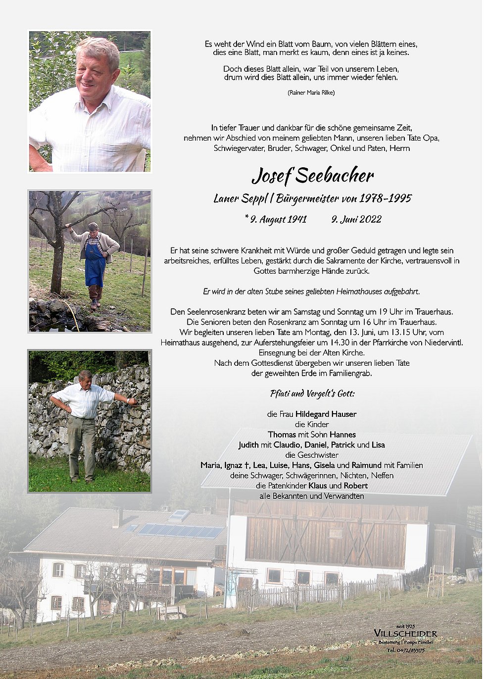 Mein Beileid gilt der Trauerfamilie Sepp Seebacher. Ich werde meinem alten Kollegen vom Registeramt ein gutes Andenken bewahren. Albrecht Lucerna Welsberg