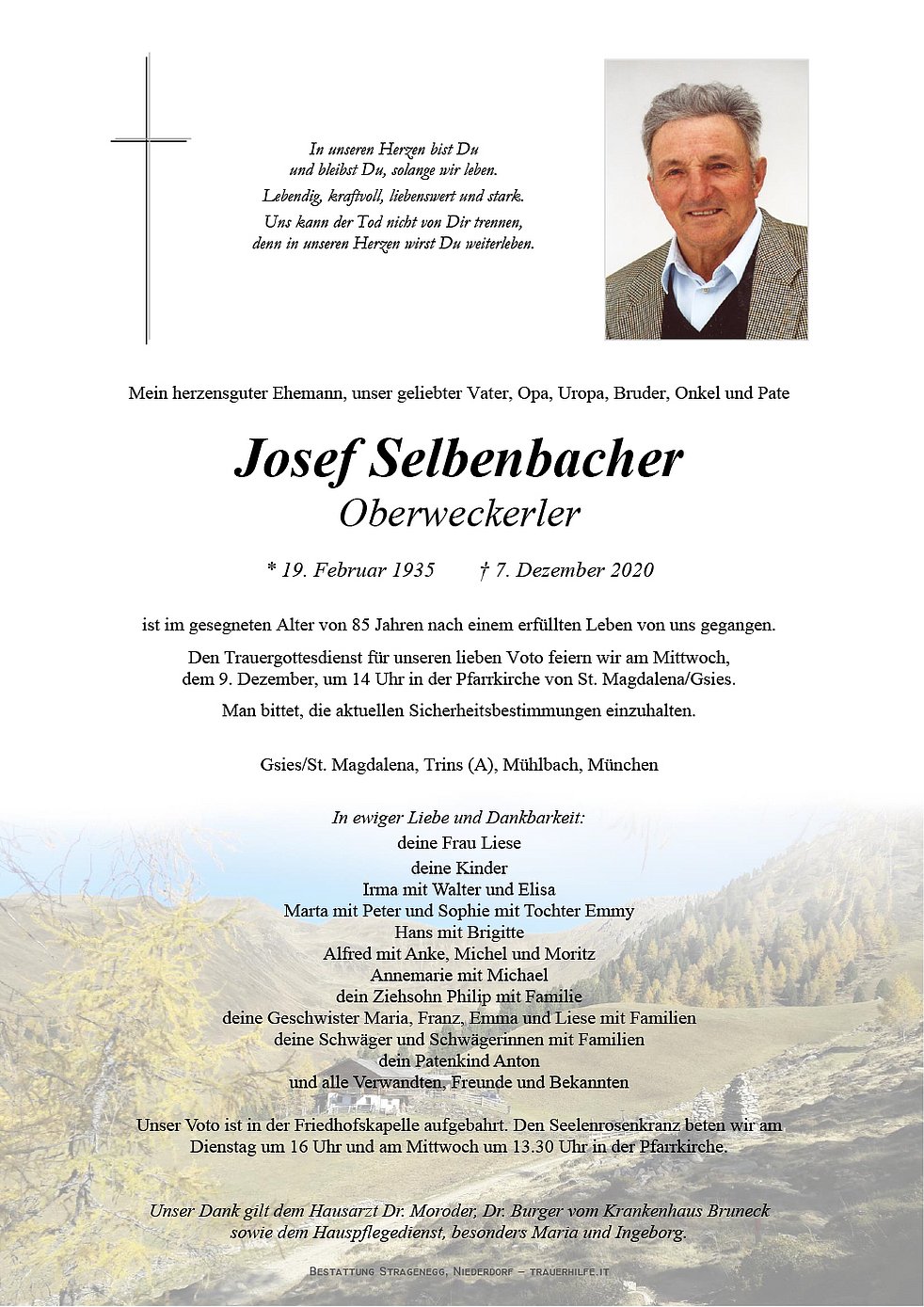 Den Trauergottesdienst für unseren lieben Voto feiern wir am Mittwoch, dem 9. Dezember, um 14 Uhr in der Pfarrkirche von St. Magdalena/Gsies.
