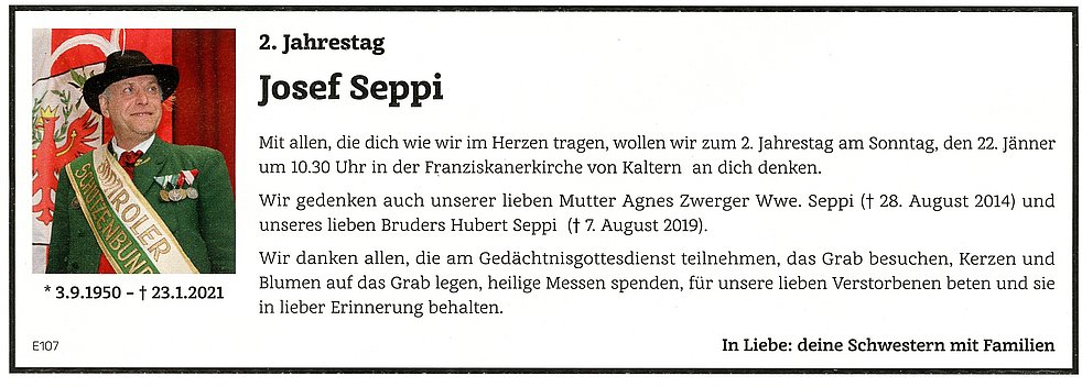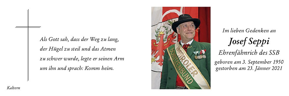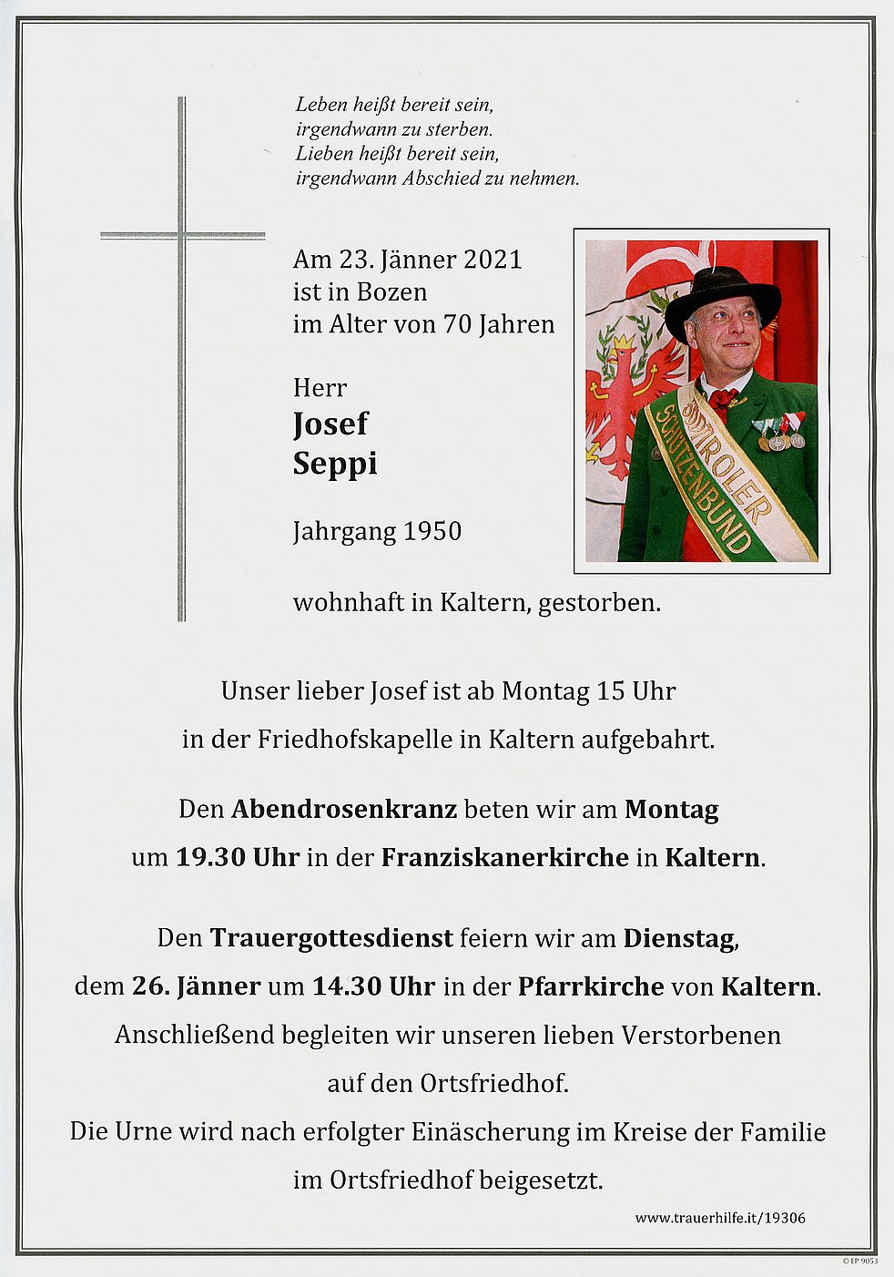 Den Trauergottesdienst feiern wir am Dienstag, dem 26. Jänner, um 14.30 Uhr in der Pfarrkirche von Kaltern. Anschließend begleiten wir unseren lieben Verstorbenen auf den Ortsfriedhof.