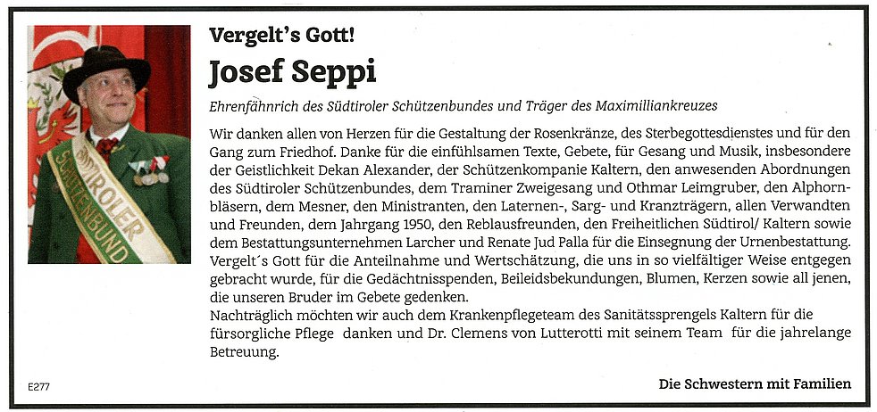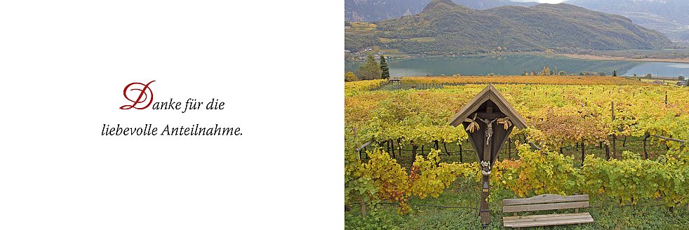 Ein besonderer Dank gilt den Mitarbeitern des Altenheimes Kaltern, insbesondere der Tagesstätte und dem Ärzte- und Pflegeteam der Kardiologie des Krankenhauses Bozen, sowie allen, die am Rosenkranzgebet und an der Beerdigung teilnehmen.