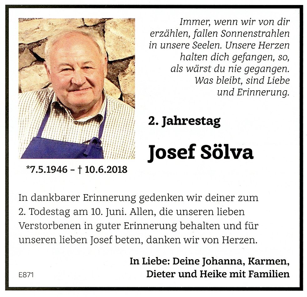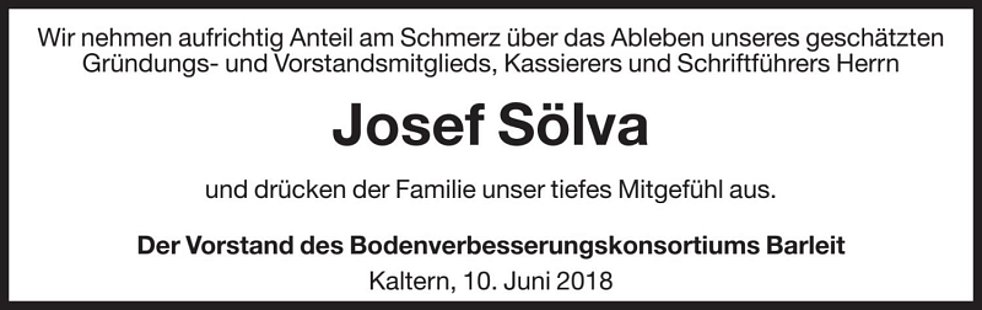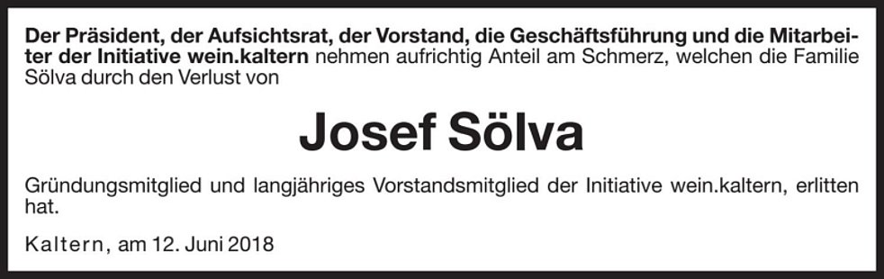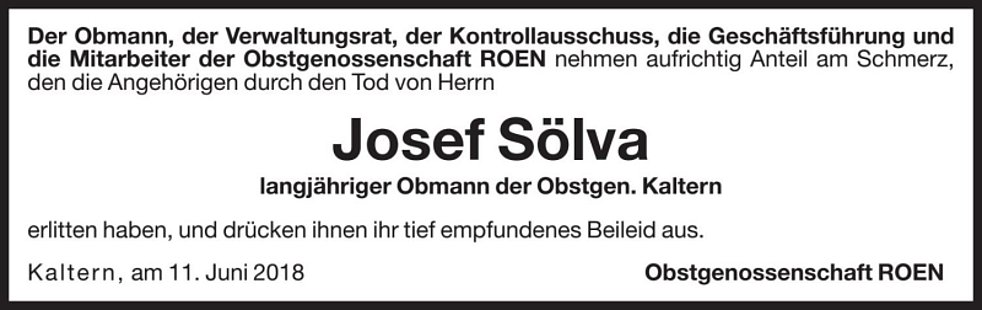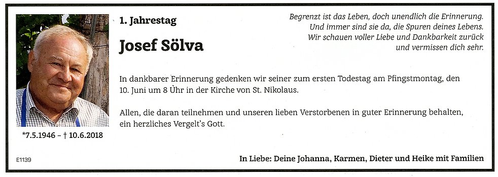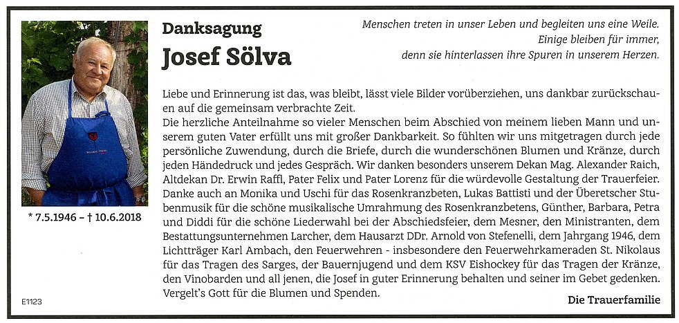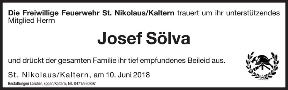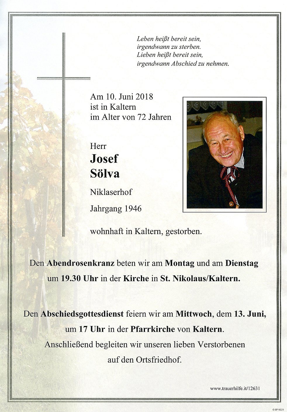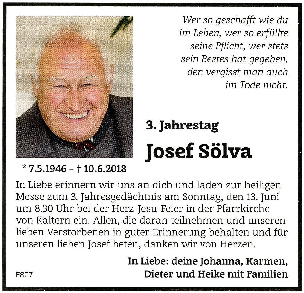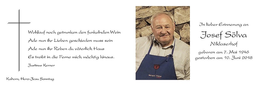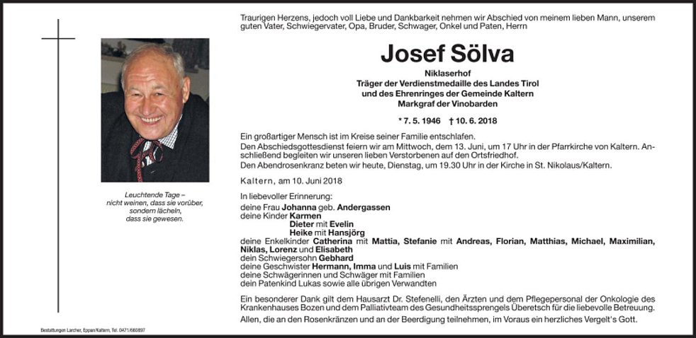 Den Abschiedsgottesdienst feiern wir am Mittwoch, dem 13. Juni um 17 Uhr in der Pfarrkirche von Kaltern. Anschließend begleiten wir unseren lieben Verstorbenen auf den Ortsfriedhof.