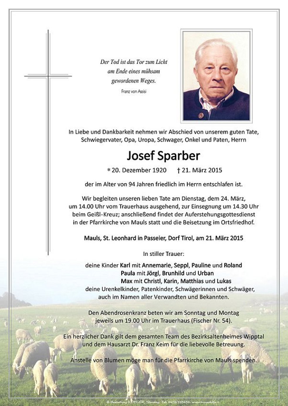Anstelle von Blumen möge man für die Pfarrkirche von Mauls spenden.