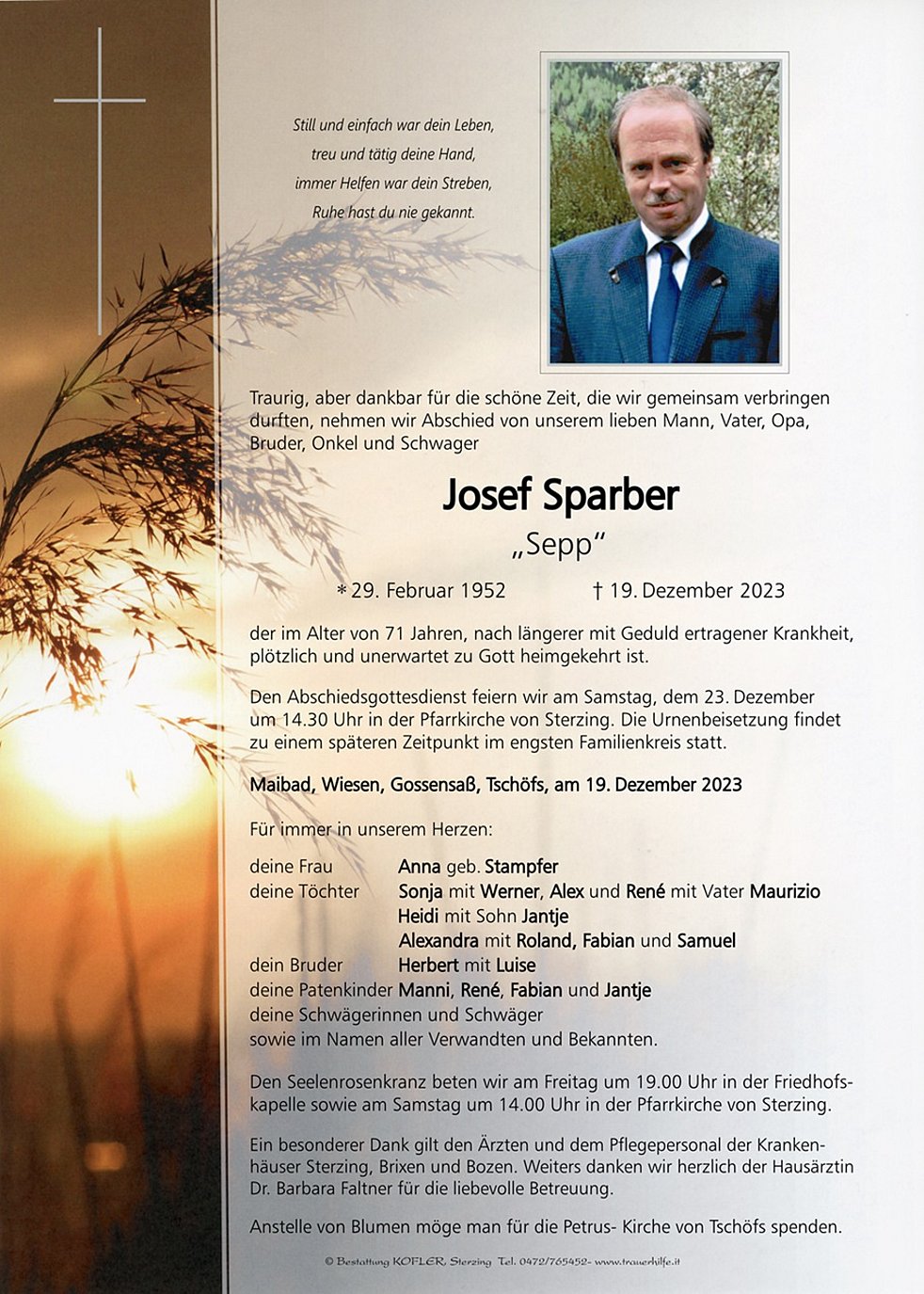 Den Abschiedsgottesdienst feiern wir am Samstag, dem 23. Dezember um 14.30 Uhr in der Pfarrkirche von Sterzing. Die Urnenbeisetzung findet zu einem späteren Zeitpunkt im engsten Familienkreis statt.