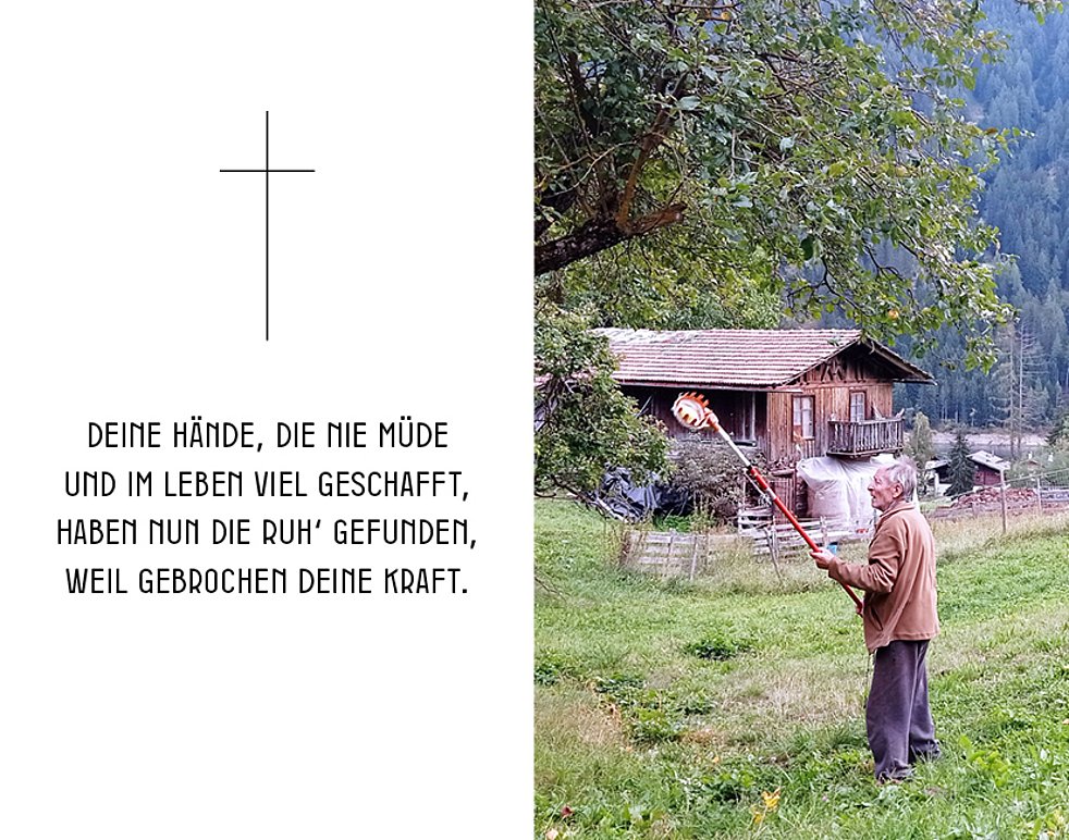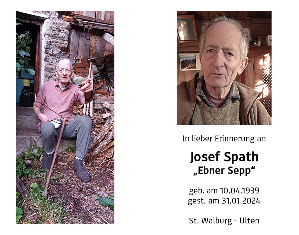 Ein aufrichtiger Dank geht an den Vertrauensarzt Dr. Bubmann für die umsichtige Begleitung in den vergangenen Wochen, den Sozialsprengel Lana (Familien- und Seniorendienste) für ihren Einsatz, an die Abteilungen Urologie und Geriatrie des Meraner Krankenhauses für die Betreuung in den letzten Tagen, an die Familien Spath und an die Nachbarn (Fam. Egger) für die Umsorgung in den vergangenen Jahren sowie an alle Menschen, die Sepp in irgendeiner Weise Zeit und gute Worte geschenkt und Hilfe angeboten haben.