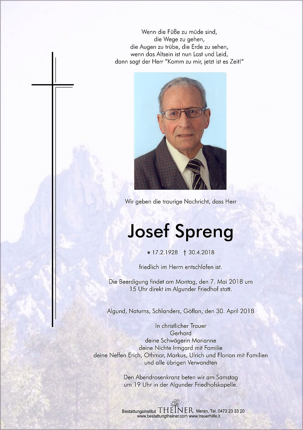 Die Beerdigung findet am Montag, den 7. Mai 2018 um 15 Uhr direkt im Algunder Friedhof statt.