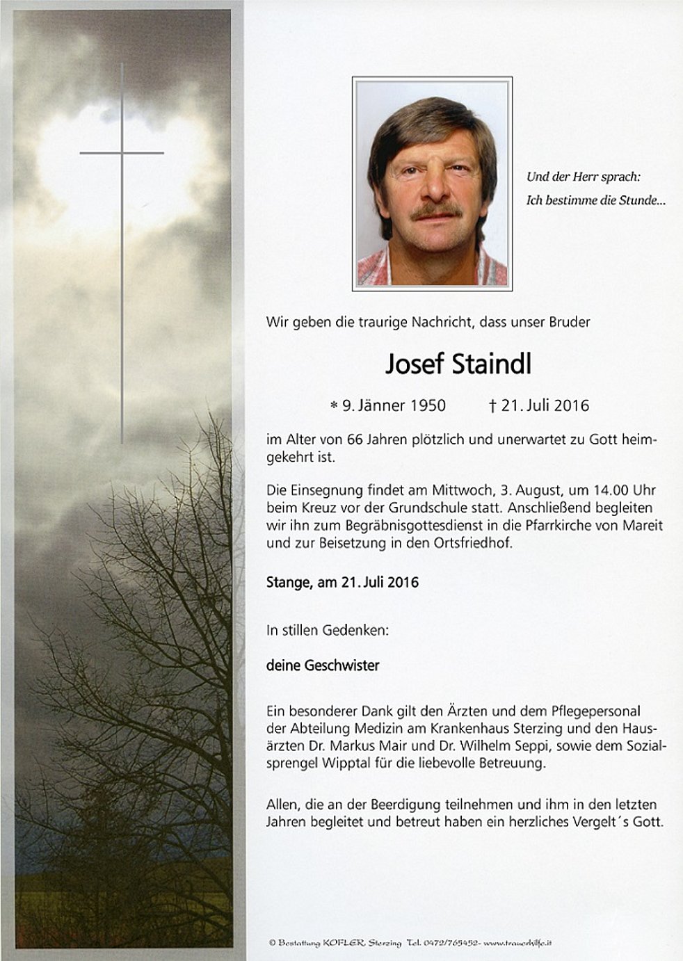 Die Einsegnung findet am Mittwoch, 3. August, um 14.00 Uhr beim Kreuz vor der Grundschule statt. Anschließend begleiten wir ihn zum Begräbnisgottesdienst in die Pfarrkirche von Mareit und zur Beisetzung in den Ortsfriedhof.