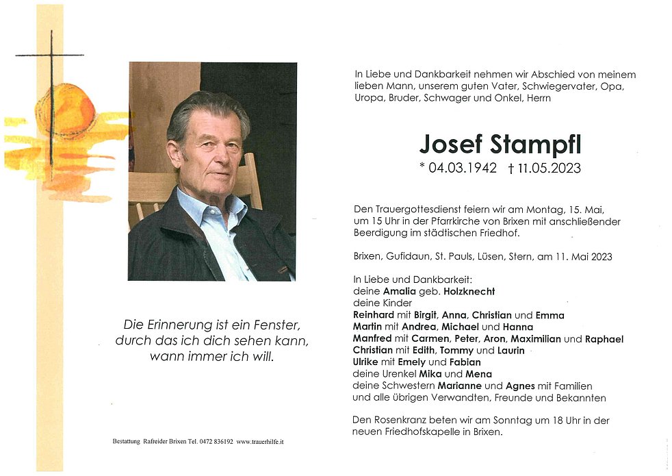 Traurig nehmen wir Anteil am Heimgang von Sepp. Mögest du die Kraft erhalten diesen Trennungsschmerz zu überwinden und in dankbarer Erinnerung zurückzuschauen auf Eure gemeinsamen Jahre. Dir und deiner Familie unser herzliches Beileid.
