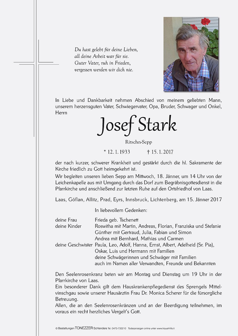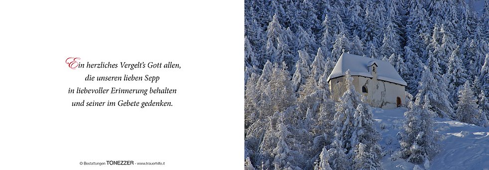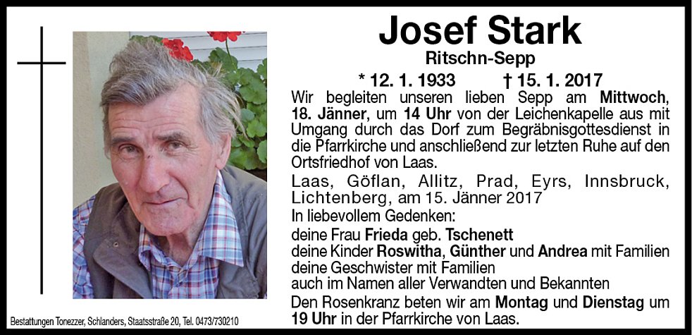 Wir begleiten unseren lieben Sepp am Mittwoch, 18. Jänner, um 14 Uhr von der Leichenkapelle aus mit Umgang durch das Dorf zum Begräbnisgottesdienst in die Pfarrkirche und anschließend zur letzten Ruhe auf den Ortsfriedhof von Laas.