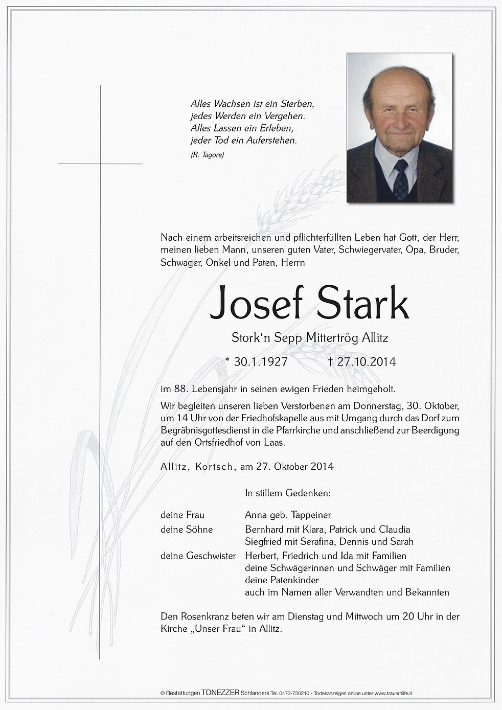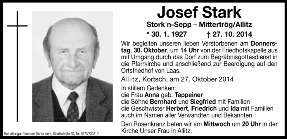 Wir begleiten unseren lieben Verstorbenen am Donnerstag, 30. Oktober, um 14 Uhr von der Friedhofskapelle aus mit Umgang durch das Dorf zum Begräbnisgottesdienst in die Pfarrkirche und anschließend zur Beerdigung auf den Ortsfriedhof von Laas.