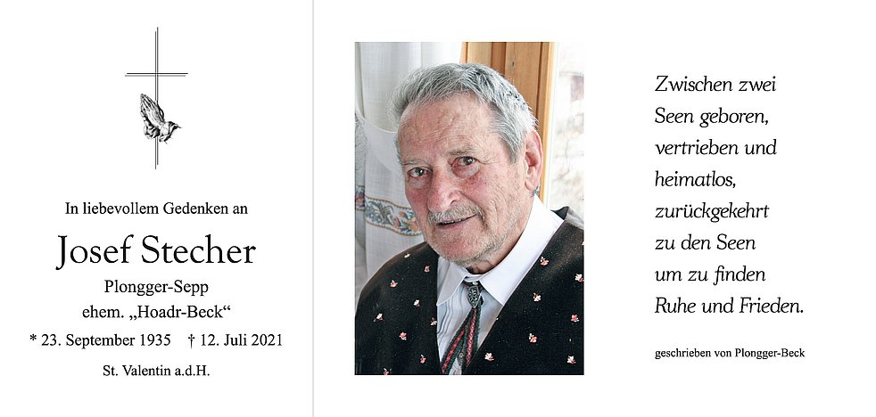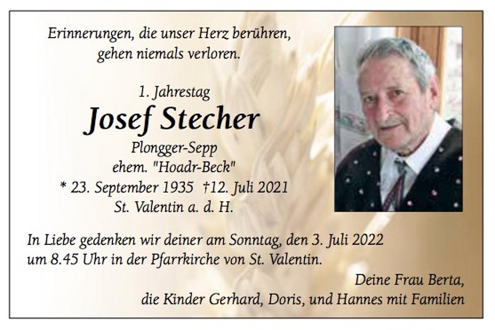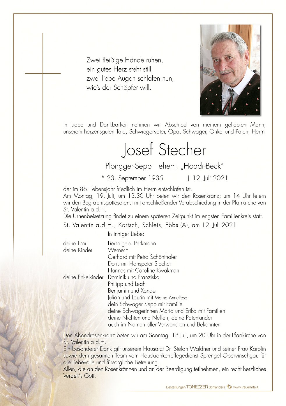 Am Montag, 19. Juli, um 13.30 Uhr beten wir den Rosenkranz; um 14 Uhr feiern wir den Begräbnisgottesdienst mit anschließender Verabschiedung in der Pfarrkirche von St. Valentin a.d.H.