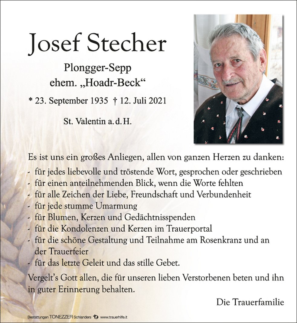 Ein besonderer Dank gilt unserem Hausarzt Dr. Stefan Waldner und seiner Frau Karolin sowie dem gesamten Team vom Hauskrankenpflegedienst Sprengel Obervinschgau für die liebevolle und fürsorgliche Betreuung.