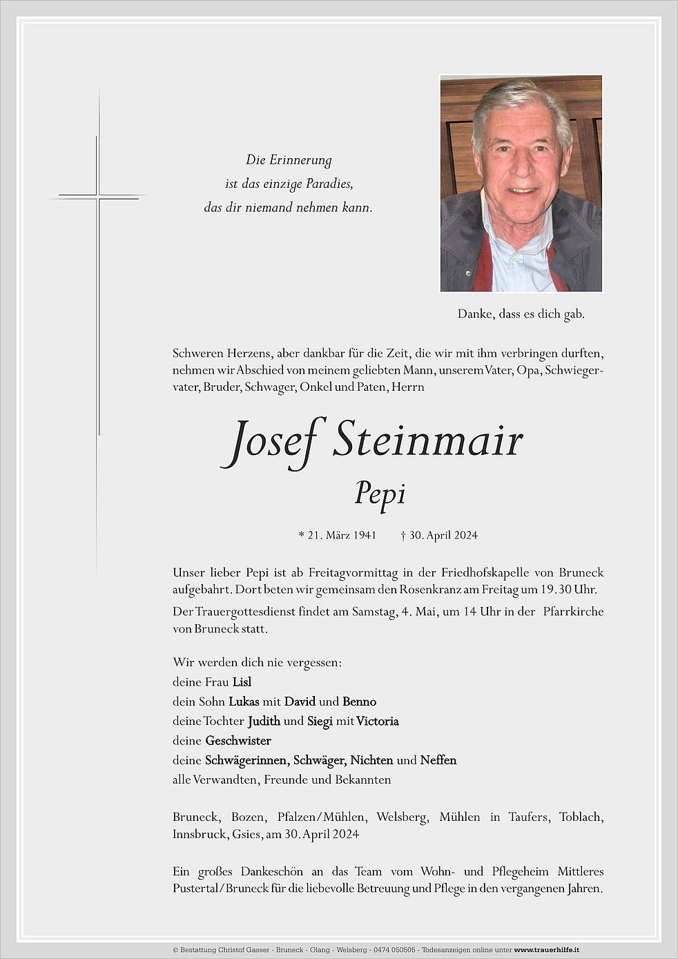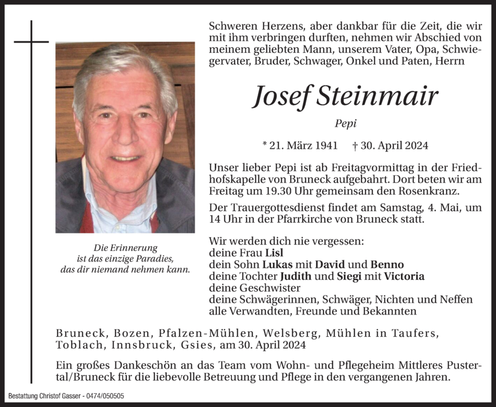 Unser lieber Pepi ist ab Freitagvormittag in der Friedhofskapelle von Bruneck aufgebahrt. Dort beten wir gemeinsam den Rosenkranz am Freitag um 19.30 Uhr.