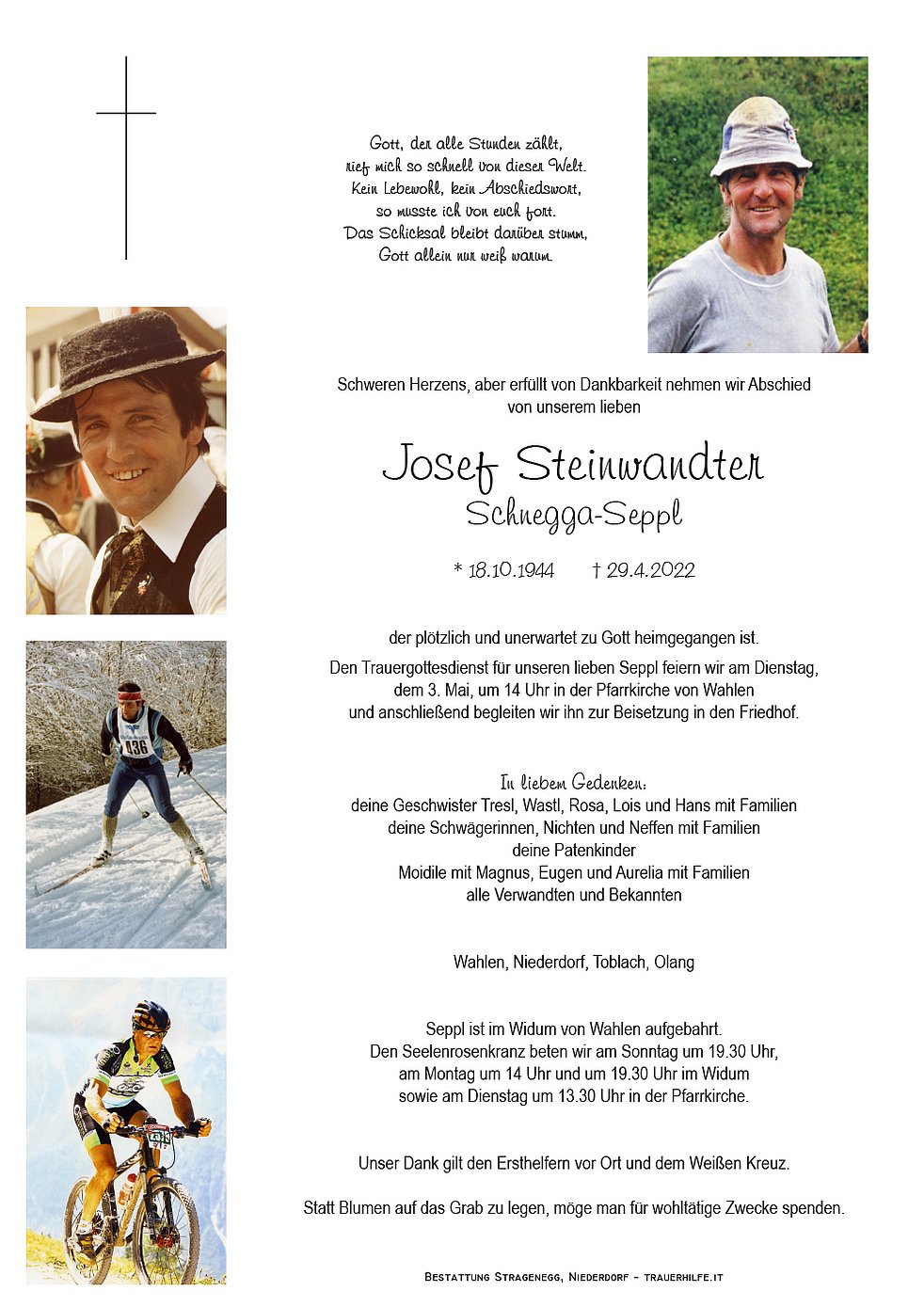 Den Trauergottesdienst für unseren lieben Seppl feiern wir am Dienstag, dem 3. Mai, um 14 Uhr in der Pfarrkirche von Wahlen und anschließend begleiten wir ihn zur Beisetzung in den Friedhof.