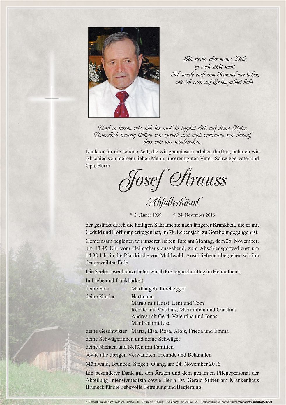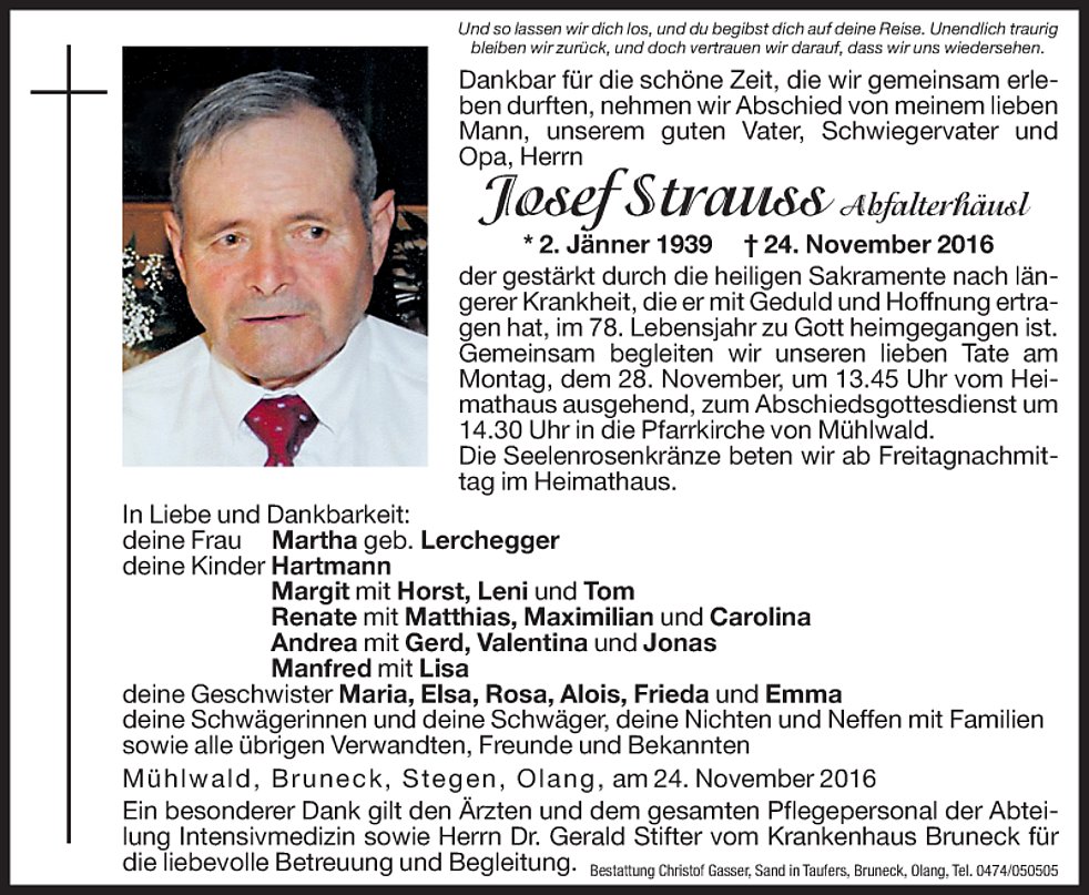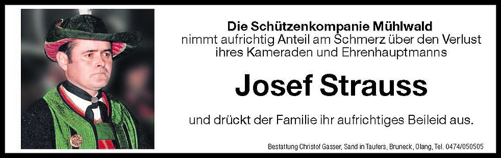 Gemeinsam begleiten wir unseren lieben Tate am Montag, dem 28. November, um 13.45 Uhr vom Heimathaus ausgehend, zum Abschiedsgottesdienst um 14.30 Uhr in die Pfarrkirche von Mühlwald. Anschließend übergeben wir ihn der geweihten Erde.