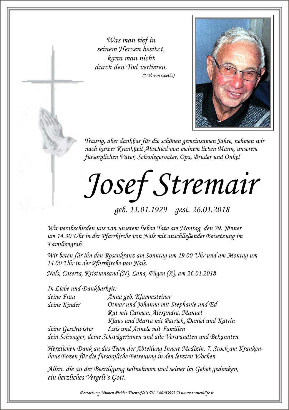 um 14.30 Uhr in der Pfarrkirche von Nals mit anschließender Beisetzung im