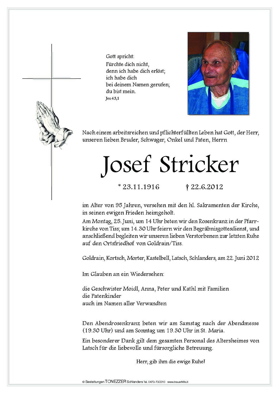 Am Montag, 25. Juni, um 14 Uhr beten wir den Rosenkranz in der Pfarrkirche von Tiss; um 14.30 Uhr feiern wir den Begräbnisgottesdienst, und anschließend begleiten wir unseren lieben Verstorbenen zur letzten Ruhe auf den Ortsfriedhof von Goldrain/Tiss.