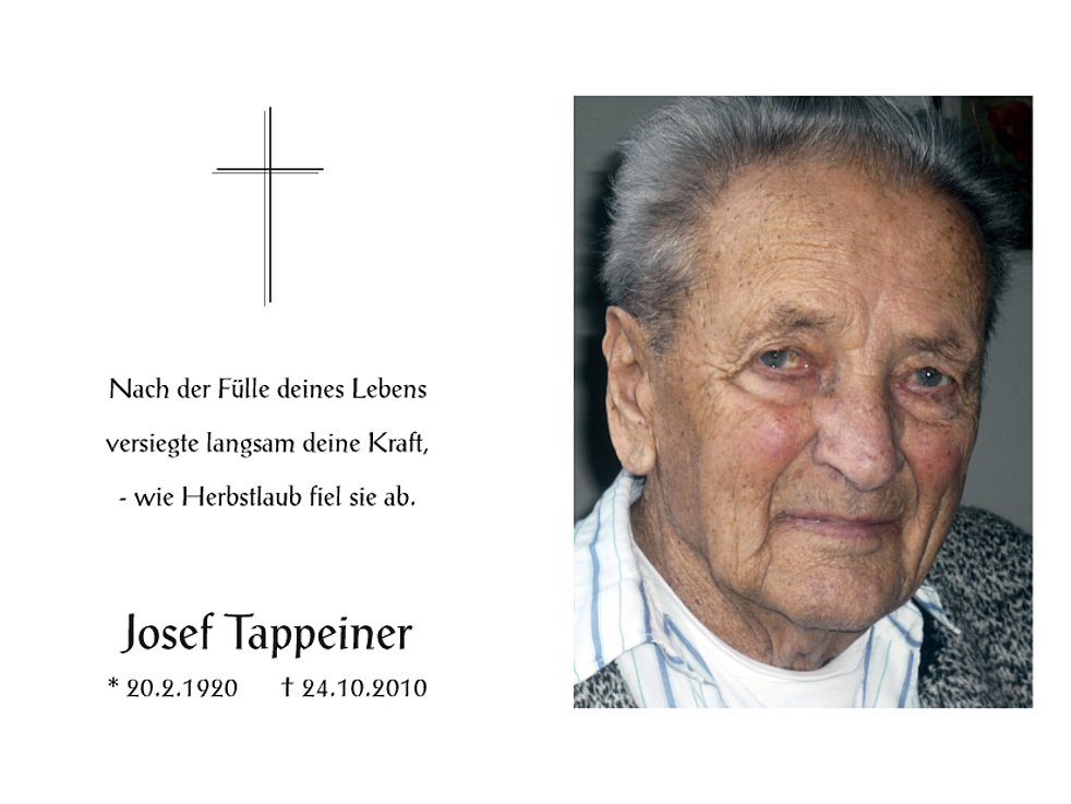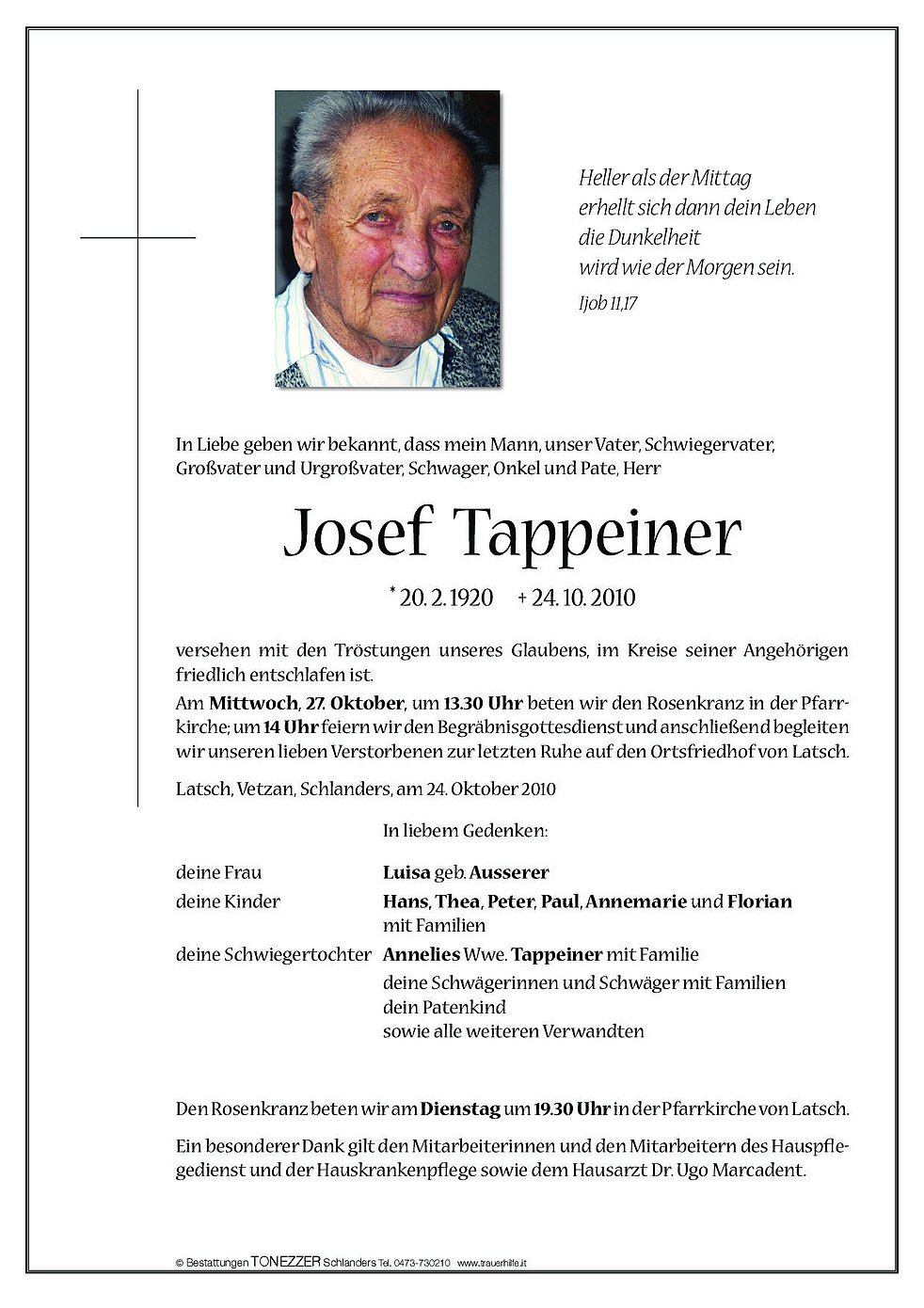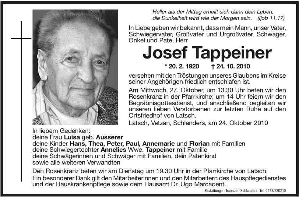 Am Mittwoch, 27. Oktober, um 13.30 Uhr beten wir den Rosenkranz in der Pfarrkirche; um 14 Uhr feiern wir den Begräbnisgottesdienst und anschließend begleiten wir unseren lieben Verstorbenen zur letzten Ruhe auf den Ortsfriedhof von Latsch.