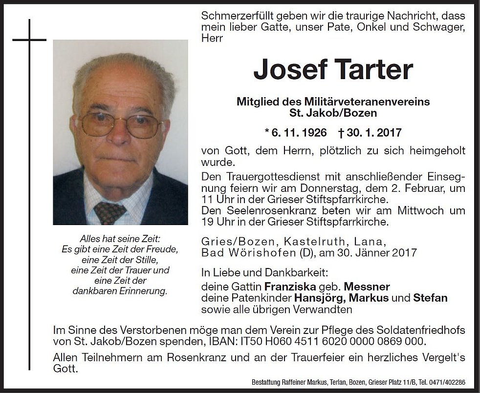 Im Sinne des Verstorbenen möge man dem Verein zur Pflege des Soldatenfriedhofes von St. Jakob/Bozen spenden. IBAN: IT50H0604511602000000869000