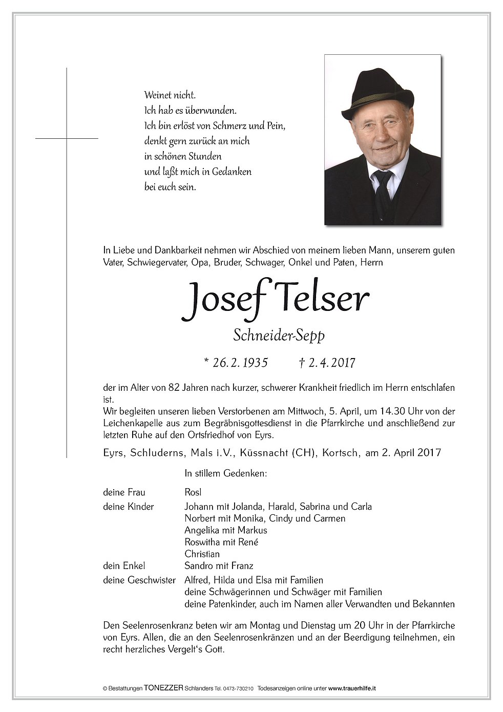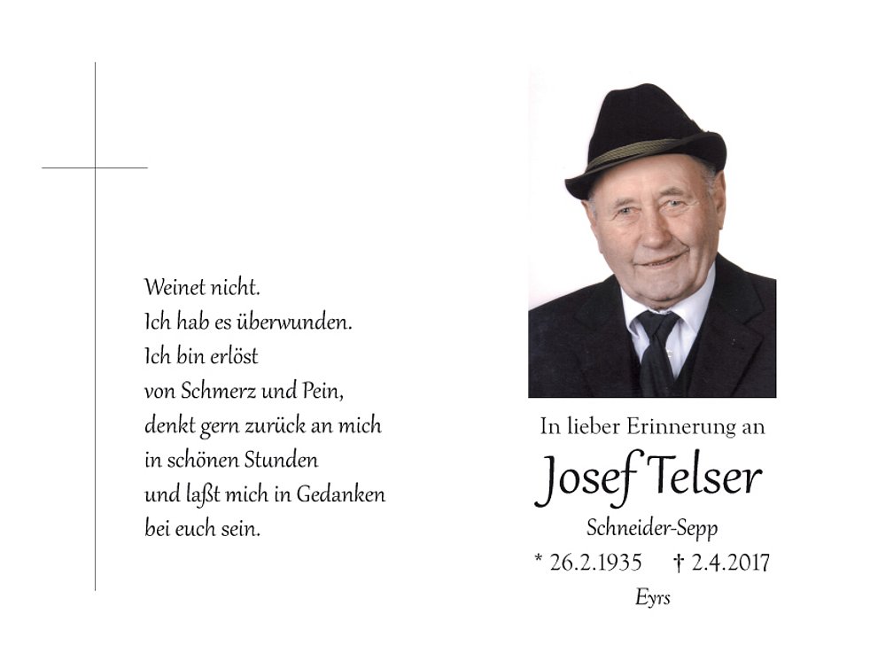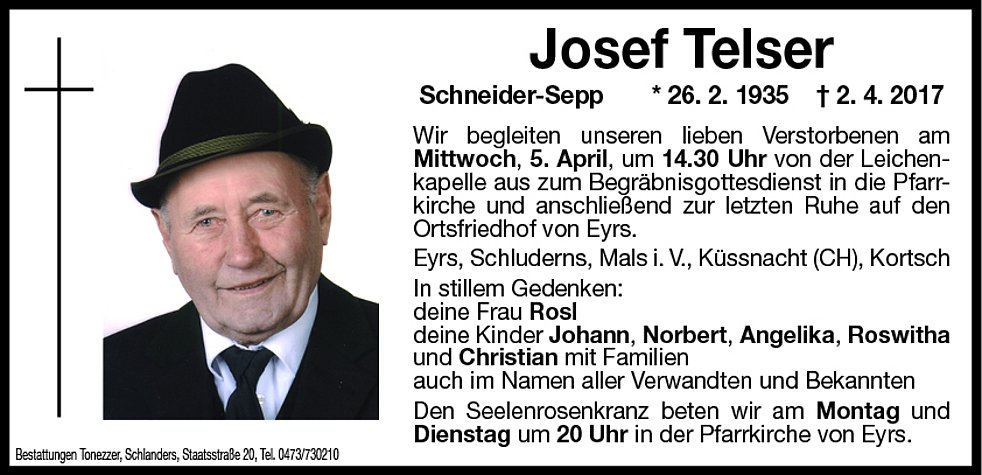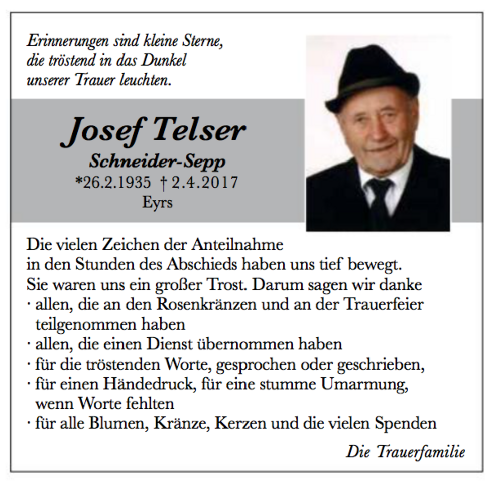 Wir begleiten unseren lieben Verstorbenen am Mittwoch, 5. April, um 14.30 Uhr von der Leichenkapelle aus zum Begräbnisgottesdienst in die Pfarrkirche und anschließend zur letzten Ruhe auf den Ortsfriedhof von Eyrs.