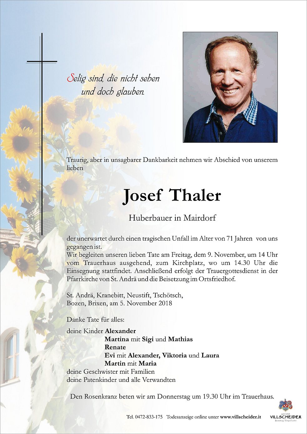 Wir begleiten unseren lieben Tate am Freitag, dem 9. November, um 14 Uhr vom Trauerhaus ausgehend, zum Kirchplatz, wo um 14.30 Uhr die Einsegnung stattfindet. Anschließend erfolgt der Trauergottesdienst in der Pfarrkirche von St. Andrä und die Beisetzung im Ortsfriedhof.